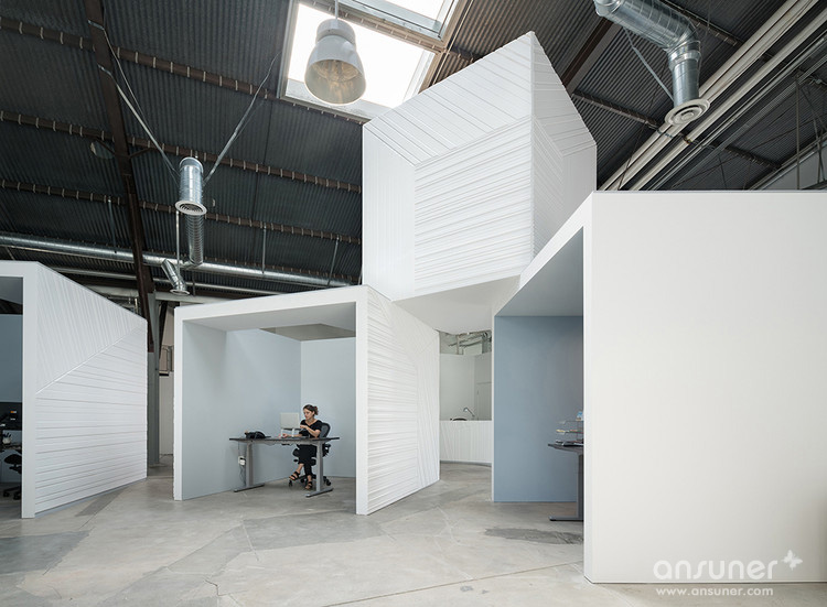FreelandBuck最近完成了在洛杉矶的Hungry Man Productions总部设计。当被要求重新考虑办公室的组织时,设计师将员工的身份的轻松与一系列颠倒的隔间相匹配 ,这些隔间有趣地挑战了典型的办公空间的规律性。整个大型开放式办公区松散组织,非正式的安排创造了多样化的稳定和灵活的工作配置。此外,设计上充分利用 了仓库外壳的天花板高度,将箱体堆积起来,使视觉上突显和投影区域。在用cnc研磨的MDF的表面处理和涂上细节的表面处理这些翻滚的立方体。从特定的角度来看 ,这些铰接的表面创造了空间错觉和活跃、动态的工作氛围。