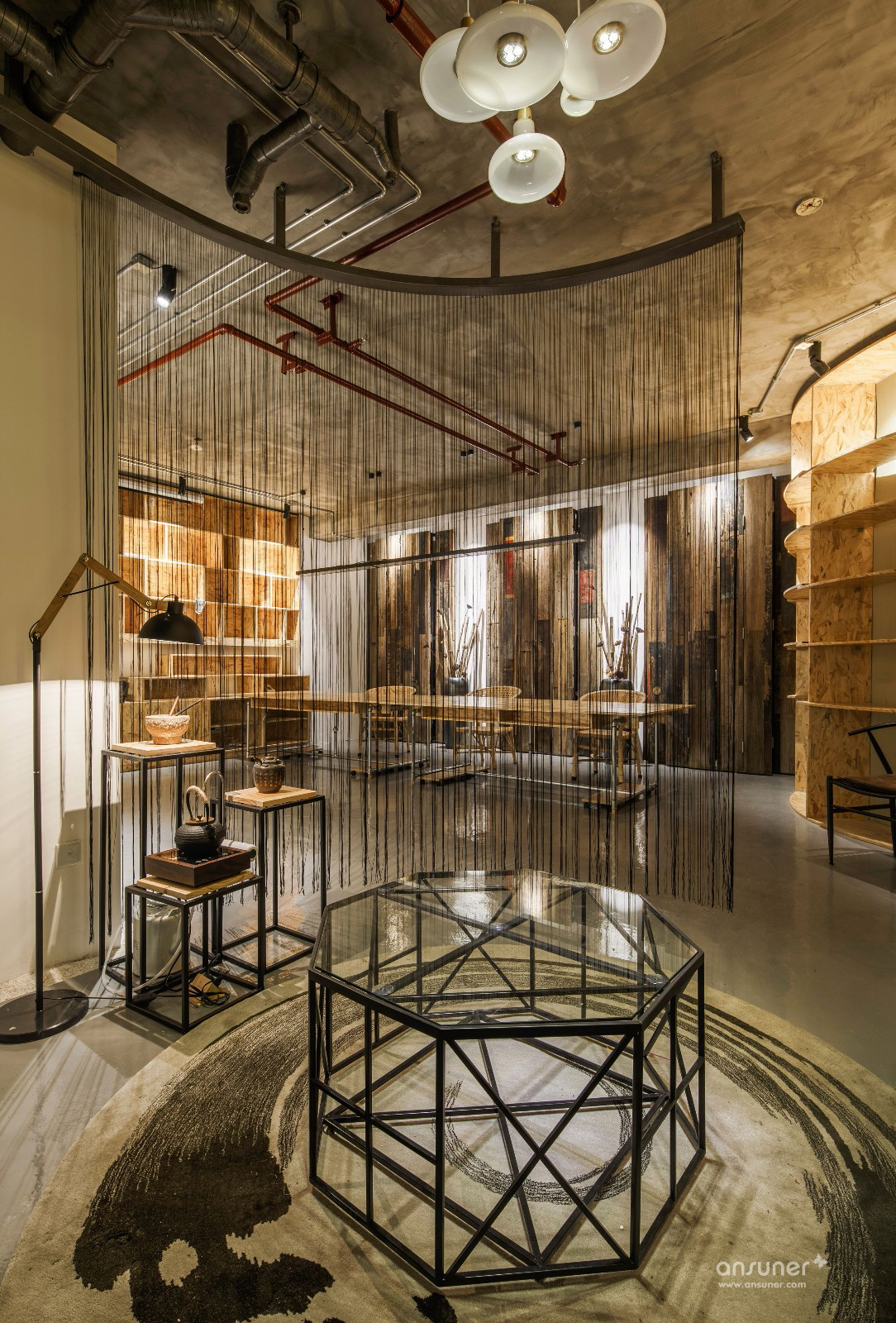 四扇落地窗将光线引入昏暗的走廊,竖向的线帘与横向的竹帘,细腻的思维和粗旷的手法,创造的重组与视觉冲击,最终达成和谐。进门后映入眼帘的老门板,从北京到长沙,传承了百年的文化经典。老门板余料拼成粗犷遒劲的木门;柔美雅致的流线型高柜,巧妙的围合出储物空间;设计师手工打造的办公桌纯粹且新颖。不寻常的空间让员工仿佛置身于老街古巷,使后现代风格也透露出历史的温暖,满足了人们在其中一切关于过去的美好幻想。