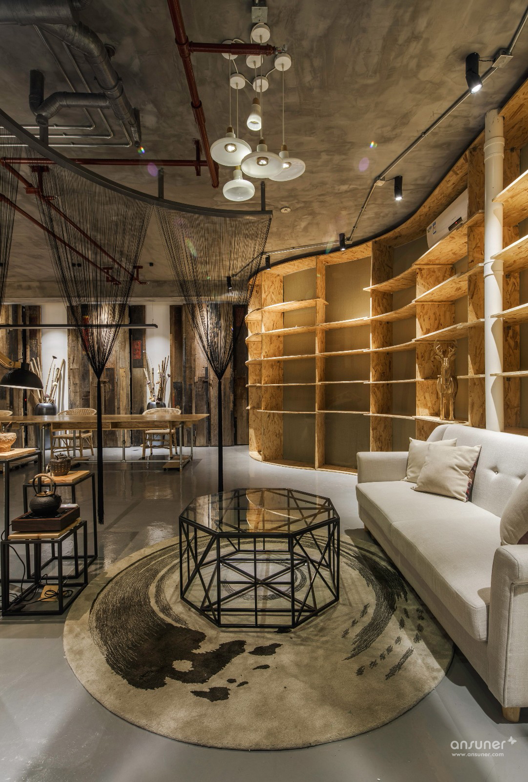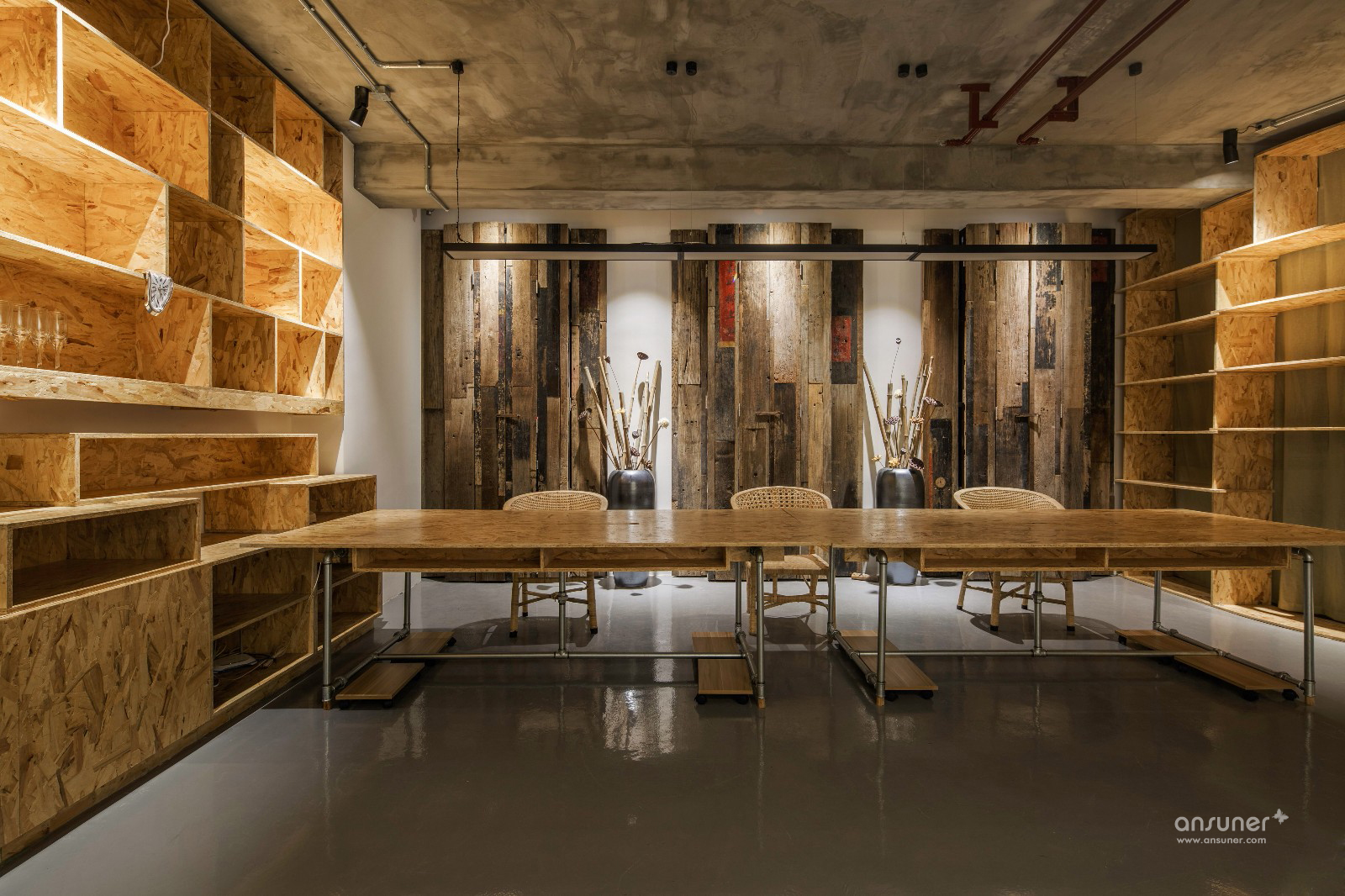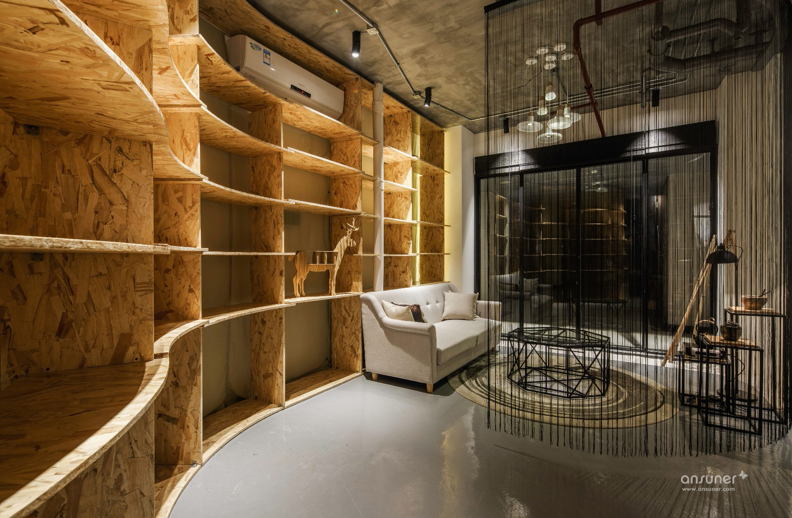 设计师通过保留清水水泥裸顶、消防管道,轻松的天花布线,以及大面积的原色欧松板,工业风直白的空间叙事,一起写下了设计本质的批注。
