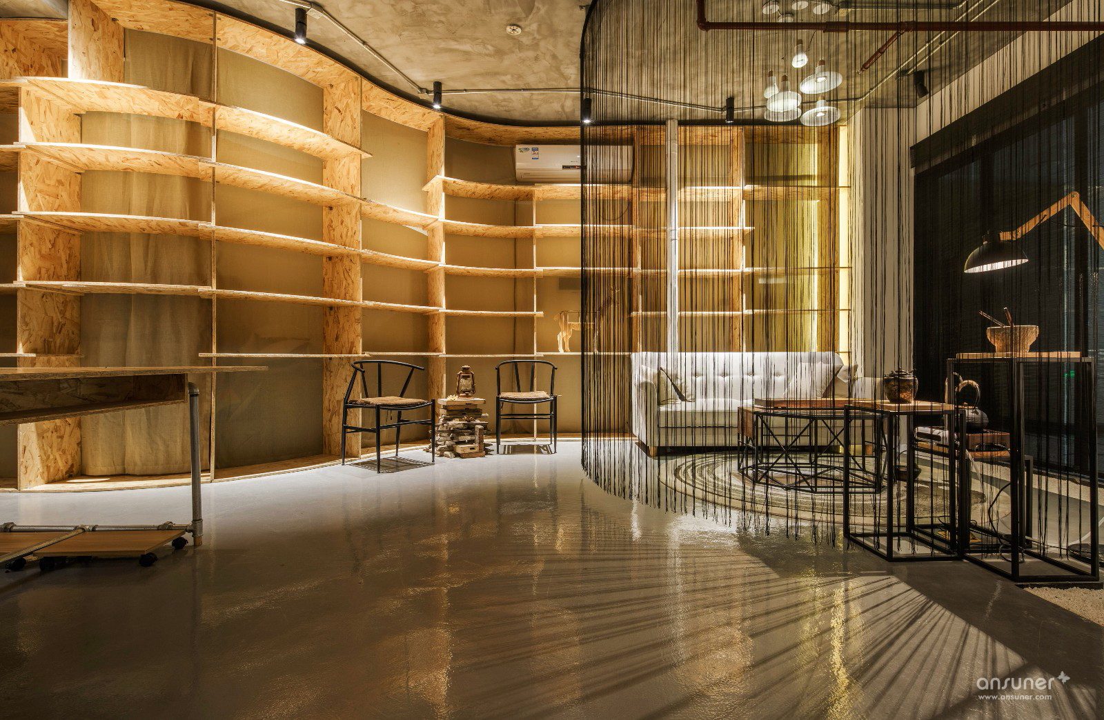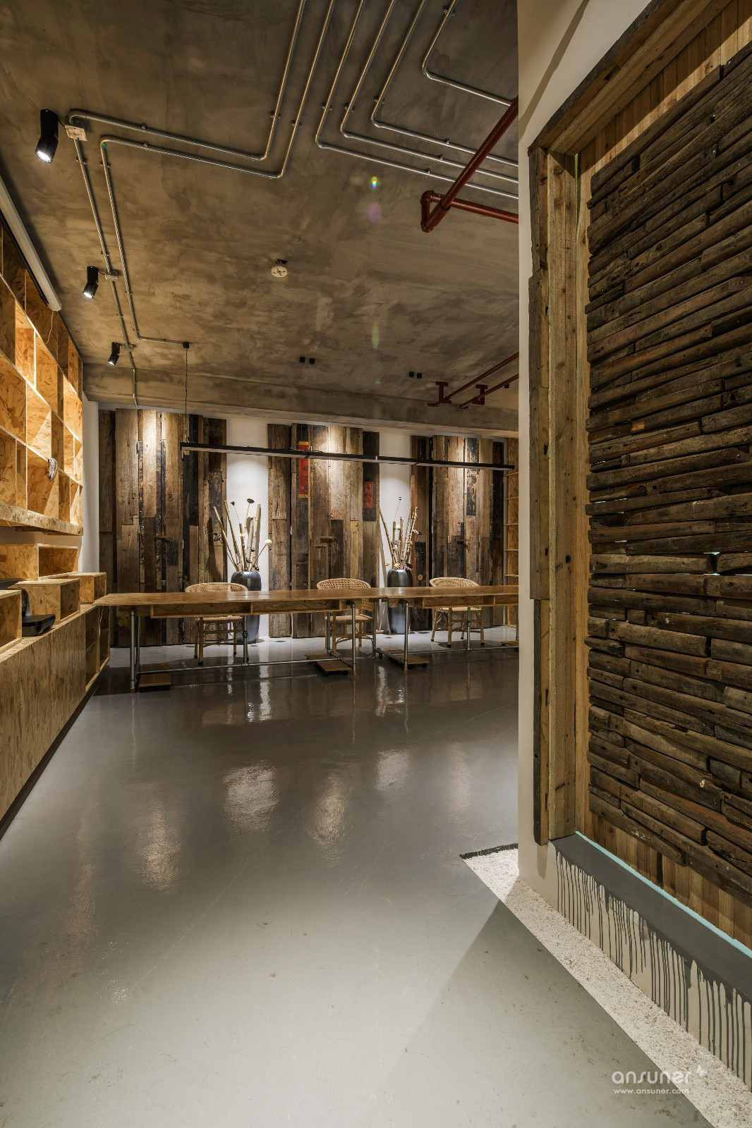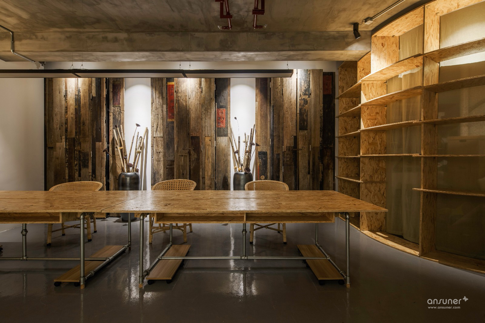 设计师通过保留清水水泥裸顶、消防管道,轻松的天花布线,以及大面积的原色欧松板,工业风直白的空间叙事,一起写下了设计本质的批注。