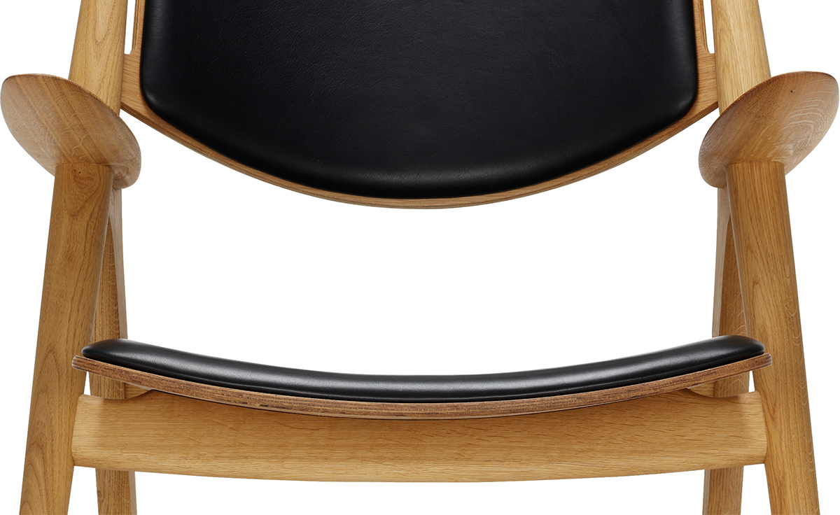 "Hans Easy Chair(汉斯简易椅)设计于1952年,2007年重新生产,是Hans J. Wegner的杰作之一。椅子的独特的造型腿形也是它最鲜明的特点。另外宽阔的扶手和较低的座板靠背都增加了这把椅子的舒适性。椅子可提供纯水曲柳实木框架、靠背曲木弯板版,也可添加织物或皮革坐垫及靠背。"