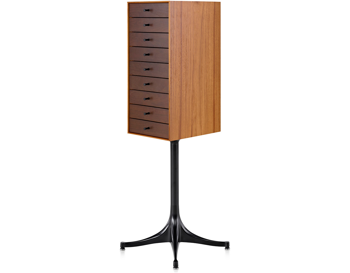 乔治·尼尔森(George Nelson)是美国极具影响力的建筑师、家具设计师和产品设计师,日本对George Nelson有着深远的影响。在他于1951年第一次到东京旅行,以及之后在那里的十几年,George Nelson迷上了日本的所有东西。这种影响最明显的的他于1952年设计的迷你箱。迷你箱的神奇处是可用来存放各种物品,是一个很多小抽屉小储物柜,方便您分类摆放各种生活物品。尼尔森设计的迷你箱最让人惊奇的是它几乎可以摆放在任何房间,无论是卧室,办公室,客厅等等任何您需要的地方,美观且不失和谐。每个抽屉都是木工们细心的安装设计,以保证高品质。抽屉采用胡桃或樱桃木皮贴面,基材为环保高密度板环保油漆喷涂、铸铝烤漆可调节脚架(4星级铝底座)、或玻璃钢一体成型脚架,抽屉贴心的配置有金属旋钮,方便打开与关上。