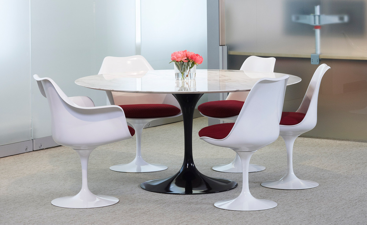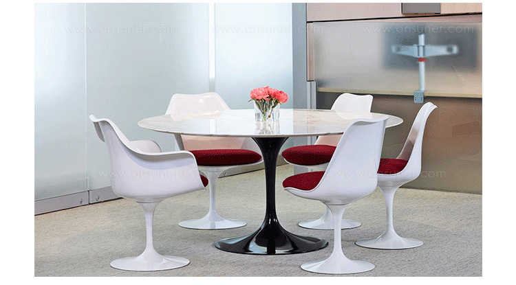 沙里宁郁金香扶手椅设有铸铝底座。外壳是用增强玻璃钢材料完成。座垫是可以可拆卸更换的,有拉链锁扣。