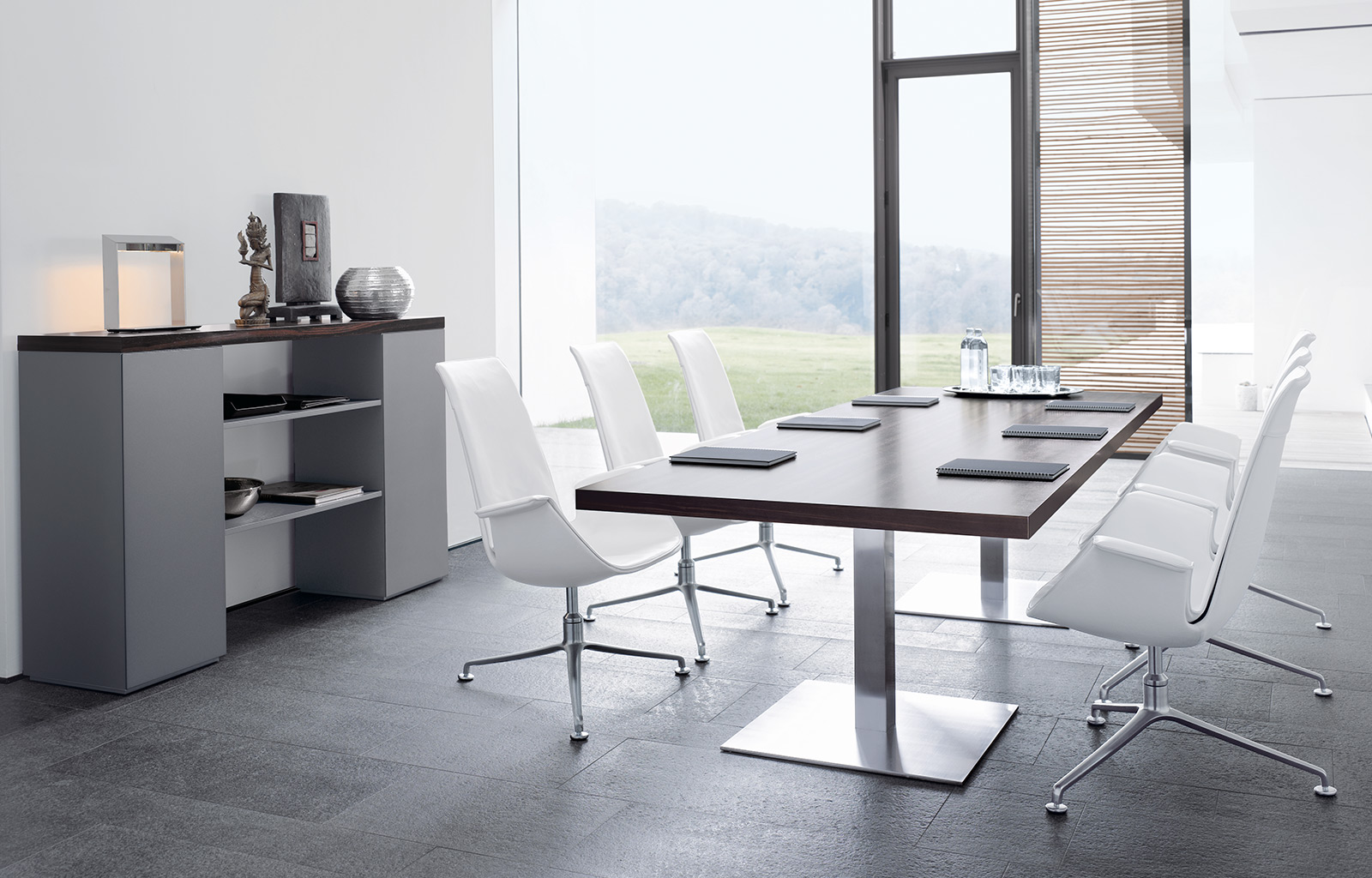桌面和侧面,水平和垂直形成一个均匀的结构,是Headoffice Mono系列会议项目设计团队所执行的结构概念。强大的线条与精选材料的优雅相结合。由侧面和桌面所制成的直角,中间的桌子上有醒目皮革包裹的面板,如果有需要,可以使用滑动皮板来打开集成线路。电缆布线隐藏在桌面和副柜之间。