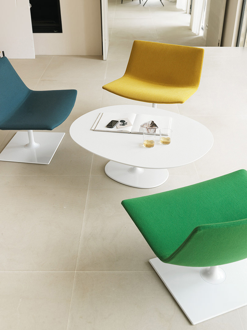 咖啡桌为椭圆形底座,白色有光泽或黑色哑光粉末涂层钢,顶部为白色压花MDF(厚2.5厘米)或层压板FenixⓇ(厚2,6厘米),有不同尺寸可供选择。 身高35厘米。