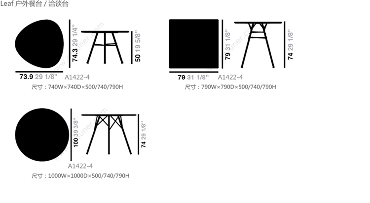 桌子有两个高度(50和74厘米 - 19 5/8''和29 1/8'')三个顶部表面:圆形(直径79和100厘米 - 31 1/8''和39 3/8 ''),正方形(79 x 79 cm - 31 1/8''x 31 1/8'')或带有圆边的三角形。