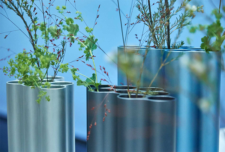 对于Nuage花瓶,设计师在不同长度的挤压铝型材中执行了云图案。基本形式的空腔现在直立放置,将花瓶分成八个单独的管,可用于巧妙地布置花和草。起伏的表面采用各种颜色的阳极氧化处理,营造出明亮的光影效果。由于其精确的外部轮廓,花瓶可以安装在一起,形成完整的“云层”。