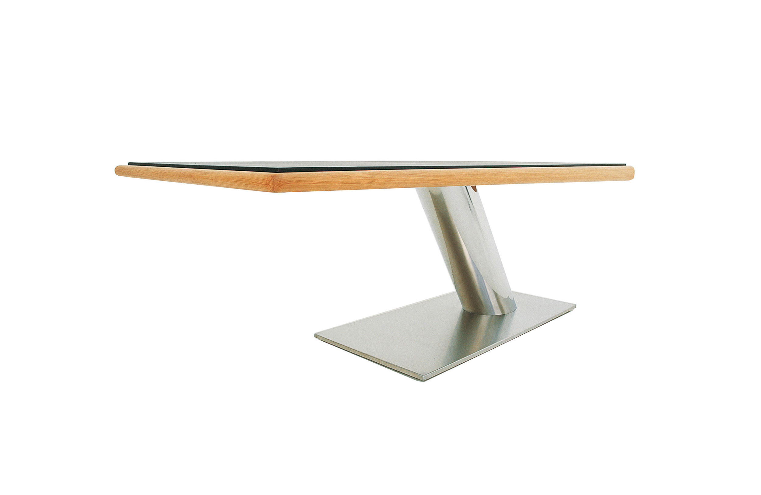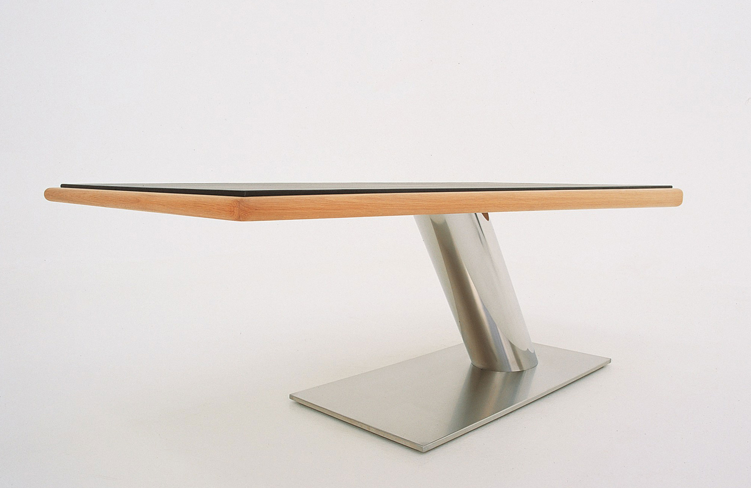 表与黑色皮革软垫桌面。桌面框架采用实心橡木制成。抛光不锈钢60o倾斜Ø250mm色谱柱底座,连接顶部和底部厚度为15 mm的铝板。底部支撑采用亚光不锈钢制成。底座配有可调节的脚矫直机。