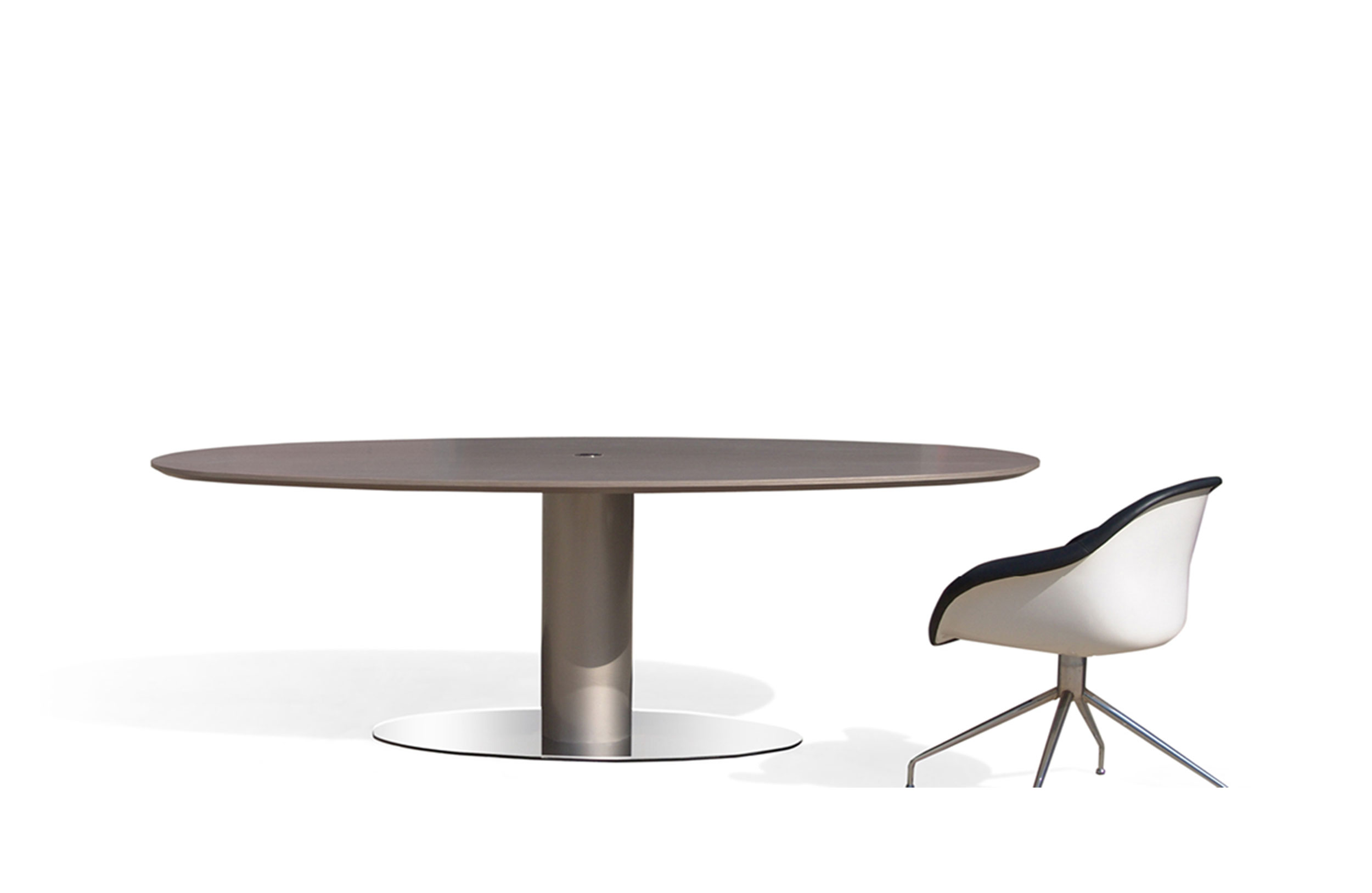 椭圆椭圆形顶桌。30毫米椭圆形桌面,底边有10毫米直边和45o斜边。脚由一个固定在圆板支撑上的cilindric金属柱组成。表面处理:顶部采用木材或微纹理漆面处理。立柱采用抛光镀铬处理。圆形底板采用缎面不锈钢表面处理。