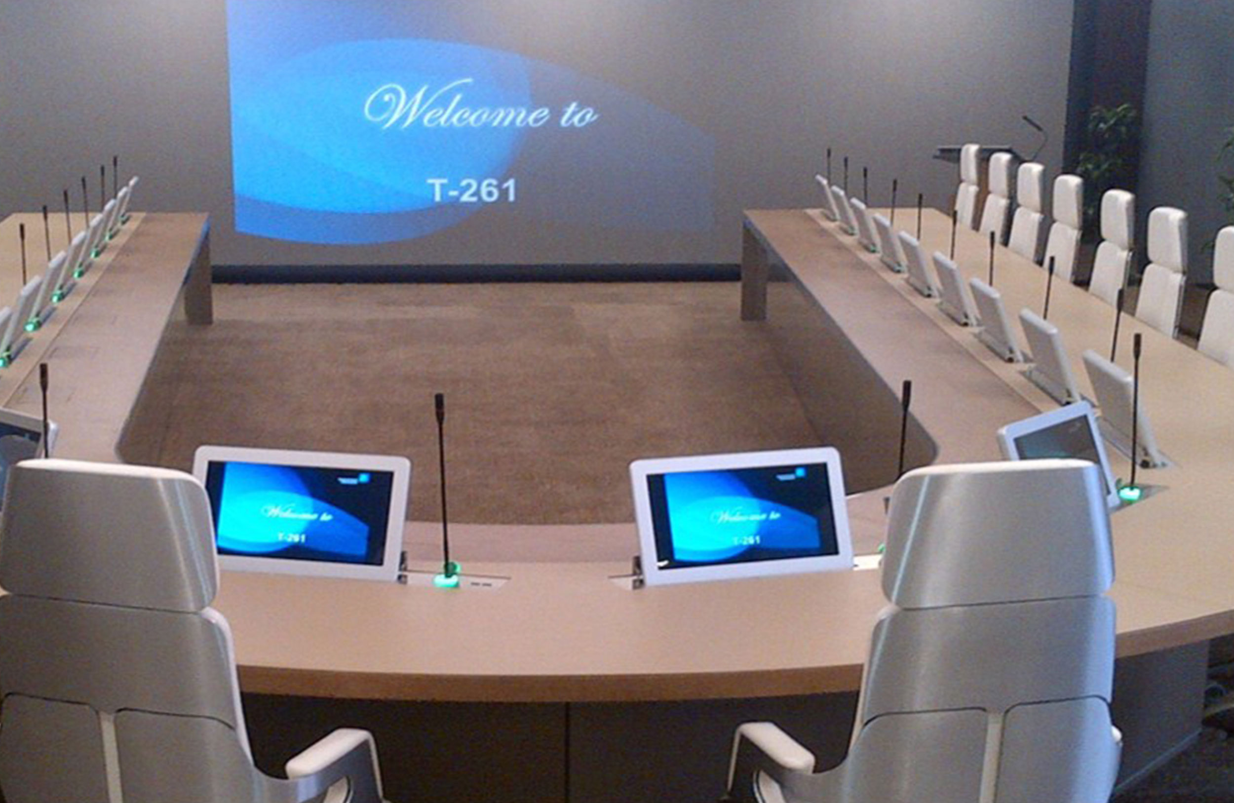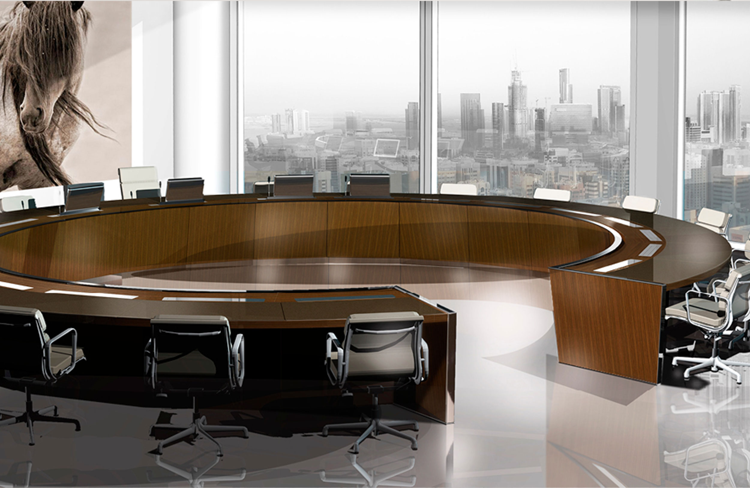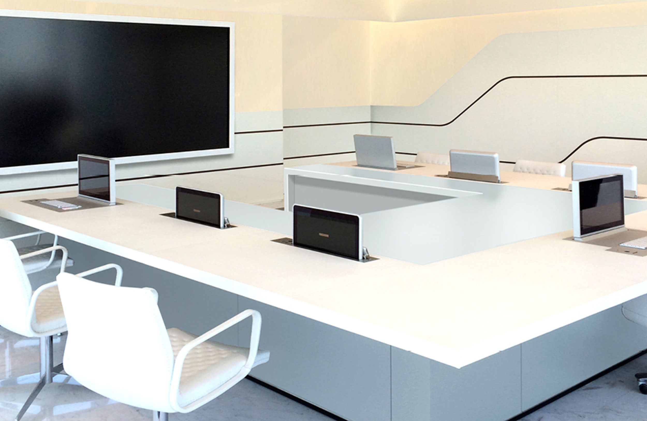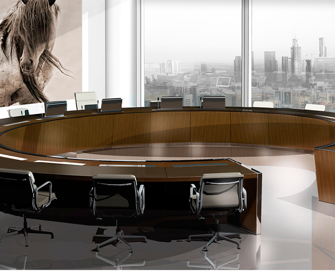 会议桌。50mm厚的弧形顶部,在桌子内侧打开。顶部分为两部分,允许不同材料和饰面的组合。表专门设计用于集成可伸缩电脑显示器,电缆管理底座由隐藏的金属结构组成,桌面内侧采用FIXED面板封闭,外部采用可拆卸面板,可方便地进入桌面内部,用于电缆管理和维护表面处理:木材混合成品,微纹理漆或Techno Leather软垫。固定板,木材或漆面。可拆卸面板,漆面。