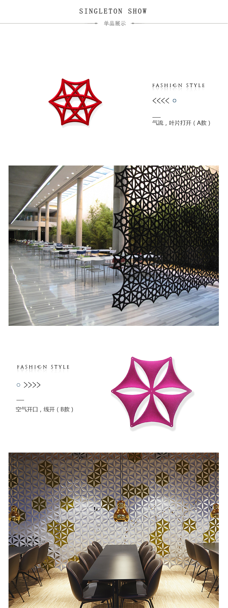 Aiflake / Airflake XL是一种基于六边形的模块化系统,可以自由组合以形成悬挂式隔断。Airflake散发出令人不快的声音反射,非常适合拥有大型开放区域的房间。Airflake由模制纤维毡制成。模块可以与塑料夹连接以产生不同类型的图案形成。使用直的或弯曲的白色或银色阳极氧化铝导轨,电线或假天花板固定在天花板或墙壁上
