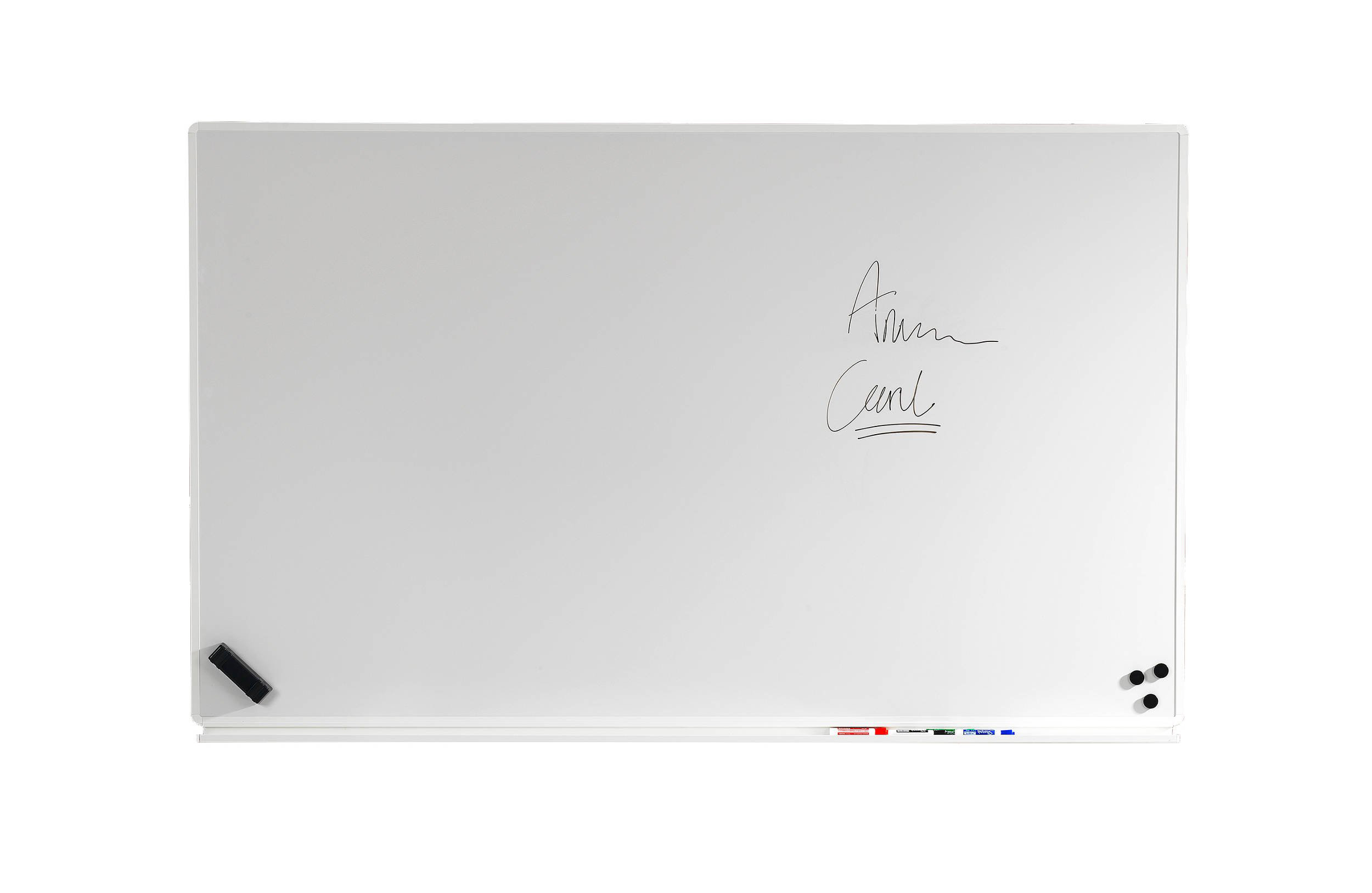 MagVision是一款高品质的移动白板,具有磁性E3-珐琅表面(NCS S 1002 G50Y),带有银色或白色阳极氧化铝框架和圆角塑料。有不同尺寸可供选择。背面覆盖有厚度为0.3毫米的铝板。白板有一个隐藏的悬挂,也有一个带轮子的支架,因此它是移动的。