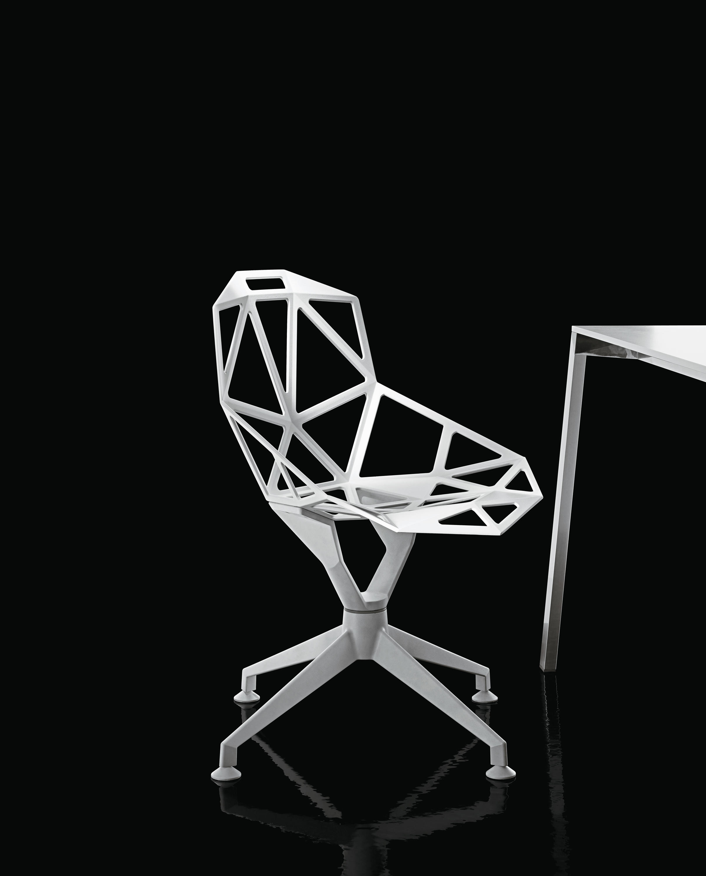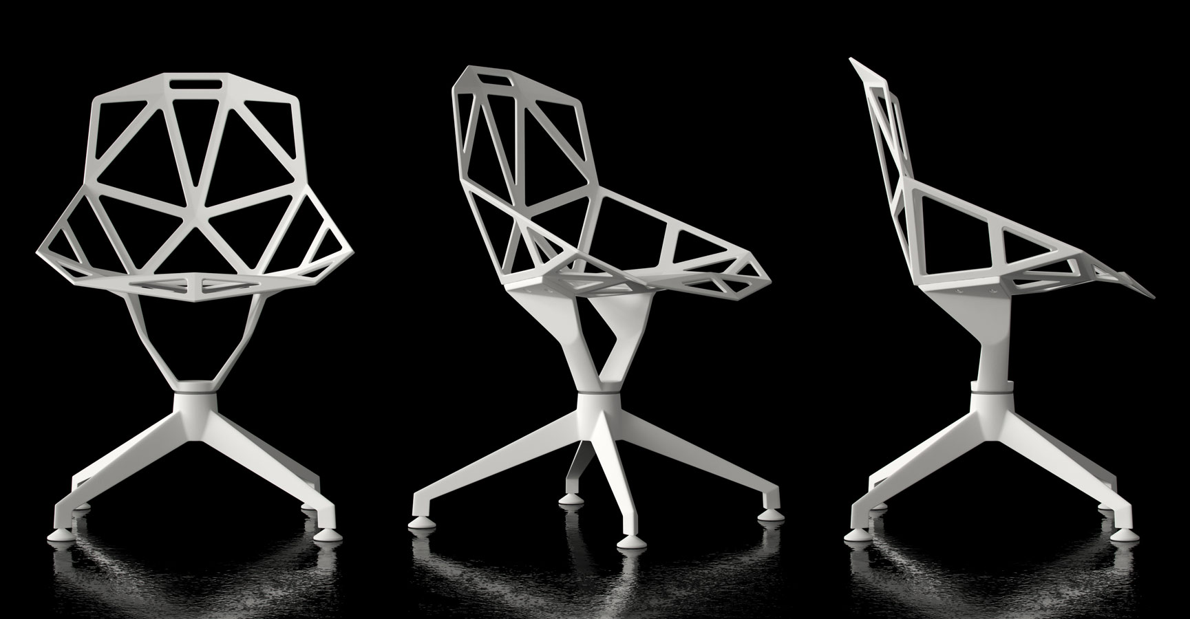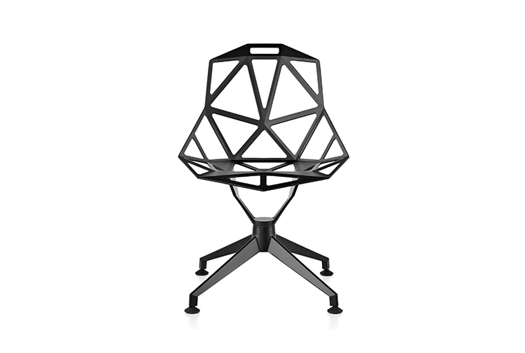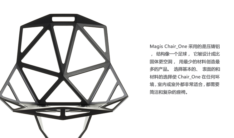 最受瞩目的德国设计师Konstantin Grcic 应邀为MAGIS 设计的Chair One(几何吧椅),是设计生涯中最具有标志的产品之一。办公椅体为模铸铝合金结构,经过氟化钛镀膜与塑料粉末涂布。椅子具有阻燃性、抗腐蚀性。适合室内及室外使用。以铝金属与钛金属制成的 Chair One,以多个平面以不同角度组合而成,建立起立体的外型。多个中空的三角型组合而成的座椅,不但令为用家带来强而有力的承托结构,而且还能在简单设计之中带出不一样的风格。这把椅子的惊人形象难免使人对它的舒适度产生疑问,但当你真正坐于其上,你会发现它实际上非常舒适,那些稀疏的网状结构能够极好地支撑不同体型的人体,后背上的把手也非常实用。当你知道Chair-One最初是被当作户外用椅而设计的,你会更加佩服Konstantin Grcic的缜密用心:极少的表面可以杜绝雨水,并且减少灰尘堆积,夸张的形态则令它能够在街道、建筑或自然的环境中拥有自己美学上的存在,而不是被环境所吞没。Konstantin Grcic花了三年时间设计Chair One,自2003年诞生以来,堪称Grcic精简主义风格的代表作。2006年,Chiar One为Konstantin Grcic赢得了德国政府的设计大奖。