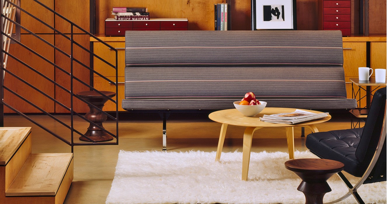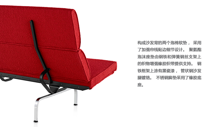 Eames紧凑型沙发既有传统笨重沙发的所有舒适性,又能轻松布置在无法使用大沙发的狭小空间内。以放在家庭的前厅、书房、工艺间或缝纫室,或是家庭办公室。可以放在行政套房、休息室和接待区。可以布置在小公寓中的起居室内,这款沙发可以提供足够的就坐位置,而且不会破坏房间比例搭配。