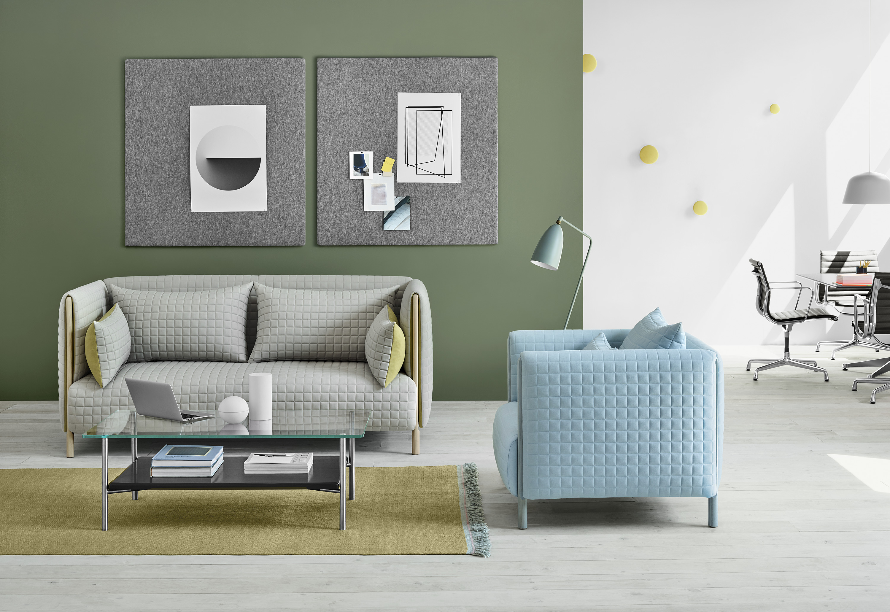 不论是工作还是在家,我们都需要一些共同空间,让我们可以进行适当交流,又能在不需要交流的时候在彼此周围独立的工作。ColourForm模块具有不同的靠背高度,能够创造出风格各异的办公环境。在需要隐私的时候,可以利用高靠背的独立组件隔断周围的环境,又可以用低靠背的模块创造出促进协作的配置。二者结合在一起,可以开创出各种有意思的地形或者引领客人穿过优雅的空间。