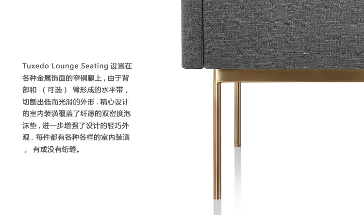 Tuxedo Lounge Seating设计用于固定休息室空间而不会在视觉上压倒周围环境,其精确的比例和精致细节。椅子可带或不带扶手,可在舒适的高度上提供深座椅。设计所依据的网格也允许Tuxedo Lounge Seating与Tuxedo系列中的其他部件(包括沙发椅,长凳和沙发)轻松配合。