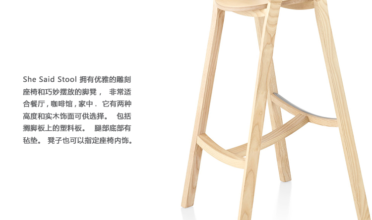 She Said Stool拥有优雅的雕刻座椅和巧妙摆放的脚凳,非常适合在餐厅,咖啡馆和家中使用。 它有两种高度和实木饰面可供选择。 包括搁脚板上的塑料板。 腿部底部有毡垫。 凳子也可以指定座椅内饰。 毫不奇怪,一家以木工而闻名的设计公司开发出了一种展示如此优雅木工的凳子
