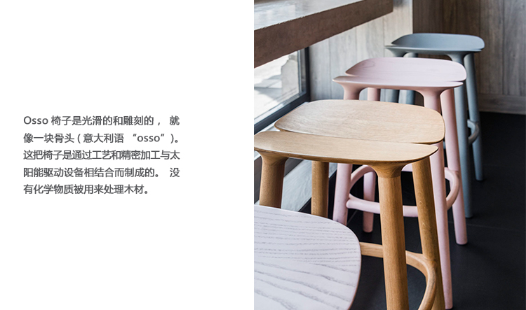 Osso椅子是光滑的和雕刻的,就像一块骨头(意大利语“osso”)。这把椅子是通过工艺和精密加工与太阳能驱动设备相结合而制成的。没有化学物质被用来处理木材。