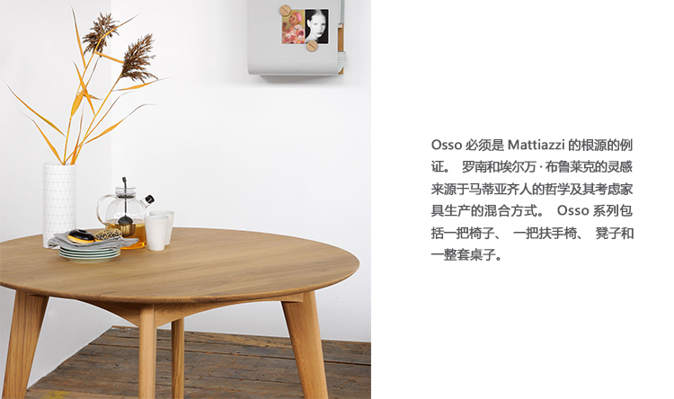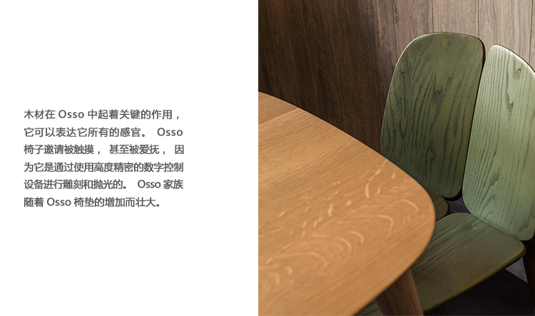 Osso必须是Mattiazzi的根源的例证。罗南和埃尔万·布鲁莱克的灵感来源于马蒂亚齐人的哲学及其考虑家具生产的混合方式。Osso系列包括一把椅子、一把扶手椅、凳子和一整套桌子。木材在Osso中起着关键的作用,它可以表达它所有的感官。Osso椅子邀请被触摸,甚至被爱抚,因为它是通过使用高度精密的数字控制设备进行雕刻和抛光的
