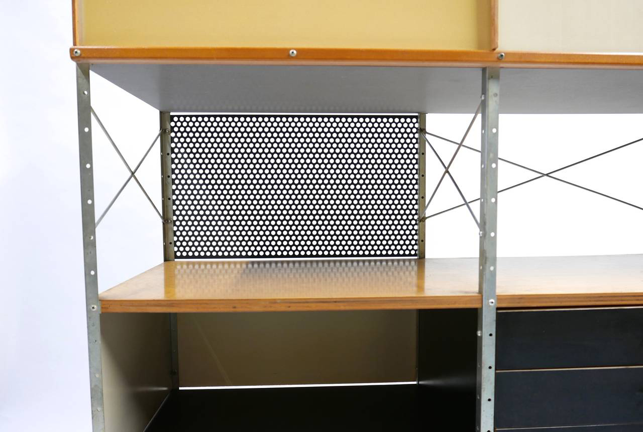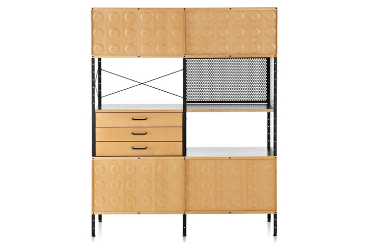Eames存储单元由五种配置和四种大小的箱子、橱柜和抽屉组成。立柱、交叉支撑板和穿孔板要么是镀锌的,要么是黑色的;橱柜的正面是凹凸不平的胶合板;抽屉的正面和架子是模制的胶合板;箱体侧面和背面的面板是涂硬木的。可供您选择两种配色方案:中性色或亮色。