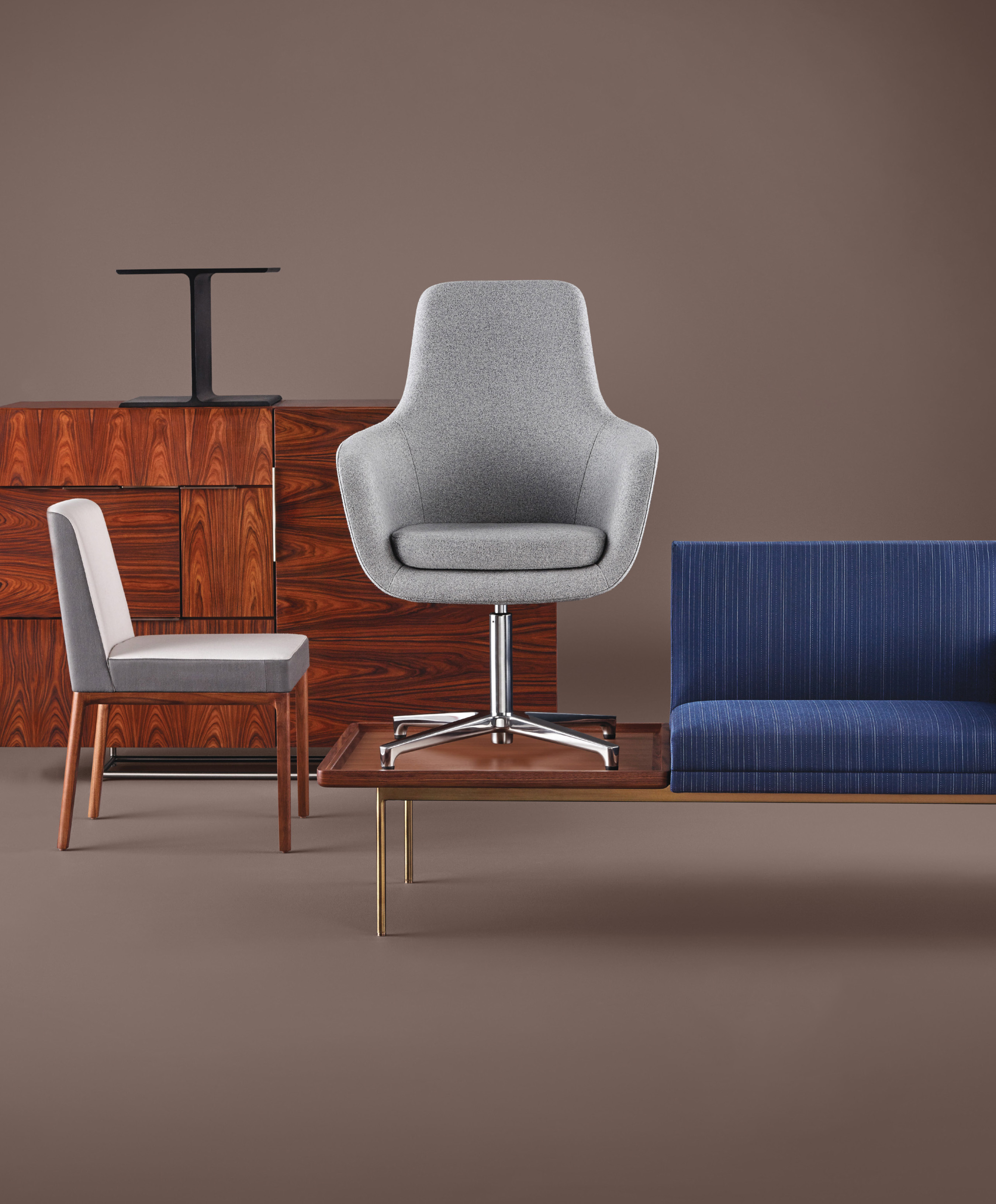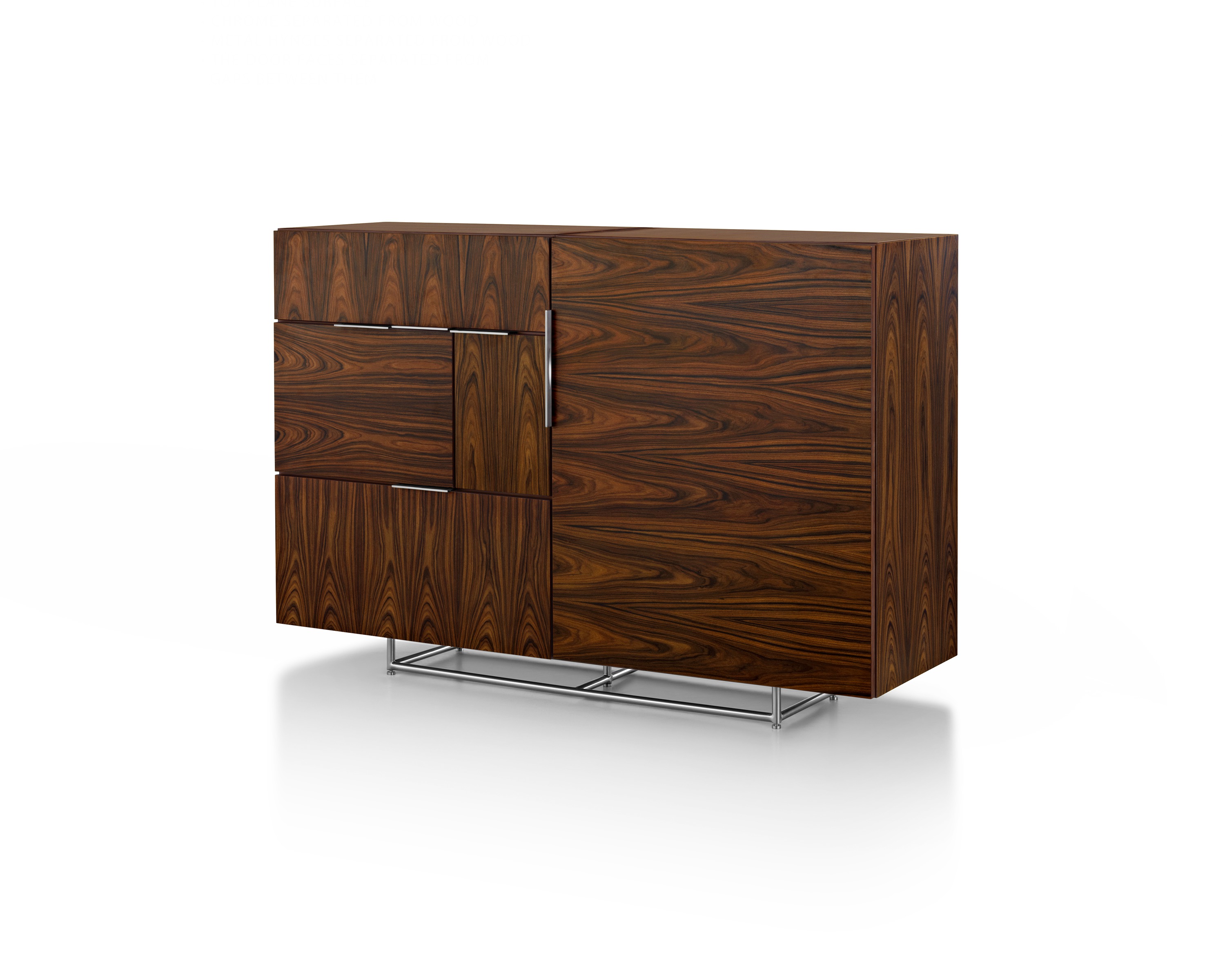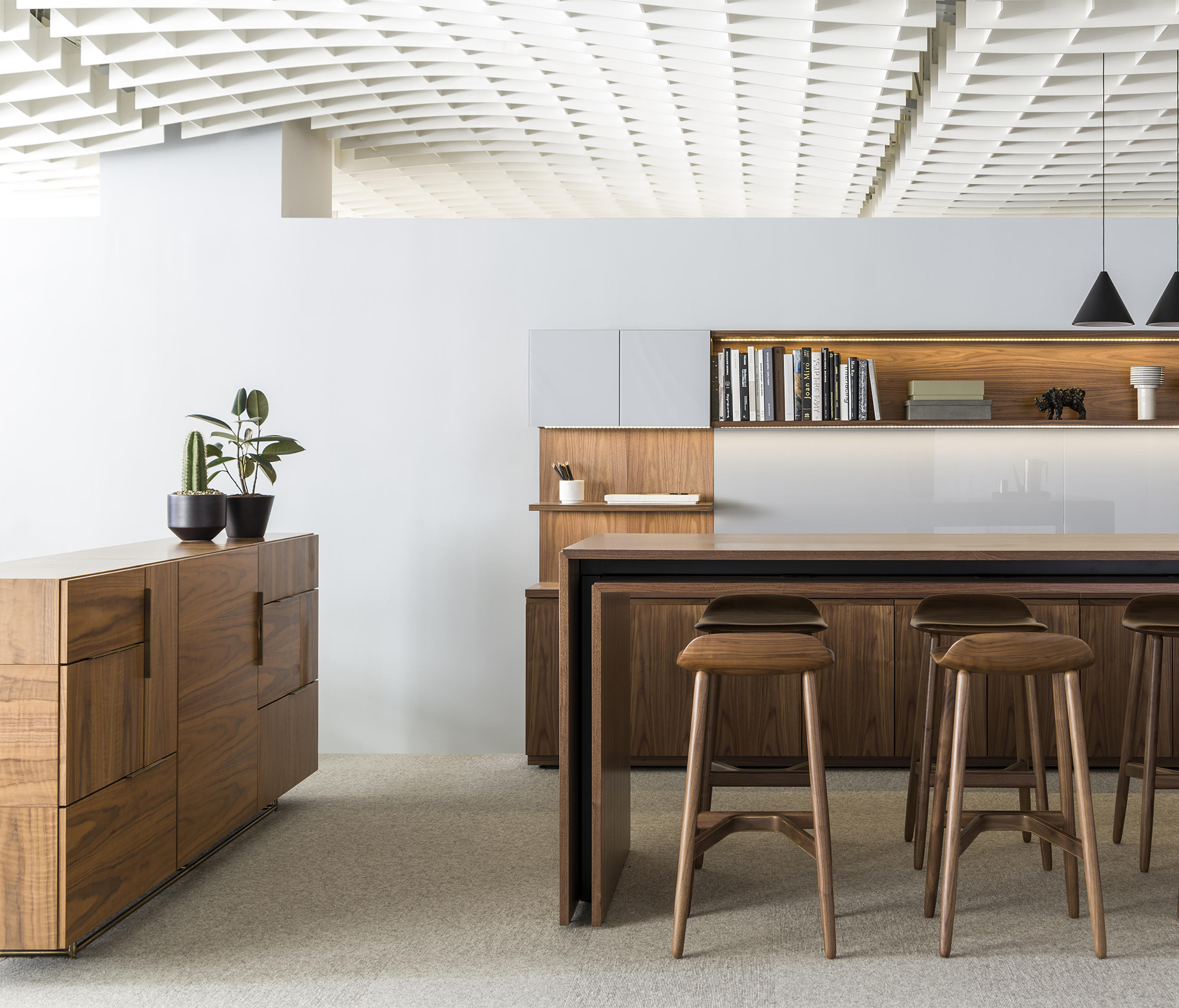 从内而外打造Domino系列绝不意味着Weinfeld忽视了外部的设计。精致的细节设计和工艺无处不在:从巧妙的胶合板到斜接转角。Domino系列方方面面都堪称完美,既可摆放在客厅和餐厅之间,也可安置在开放式办公室中。该系列可提供66.04厘米和101.6厘米两种高度选项,两单元、三单元或四单元宽度选项,以及六种格局选项。饰面采用胡桃木、巴西花梨木及黑檀木打造而成,镀铬或缎面镀铬镶边,内部采用坚固的水曲柳。