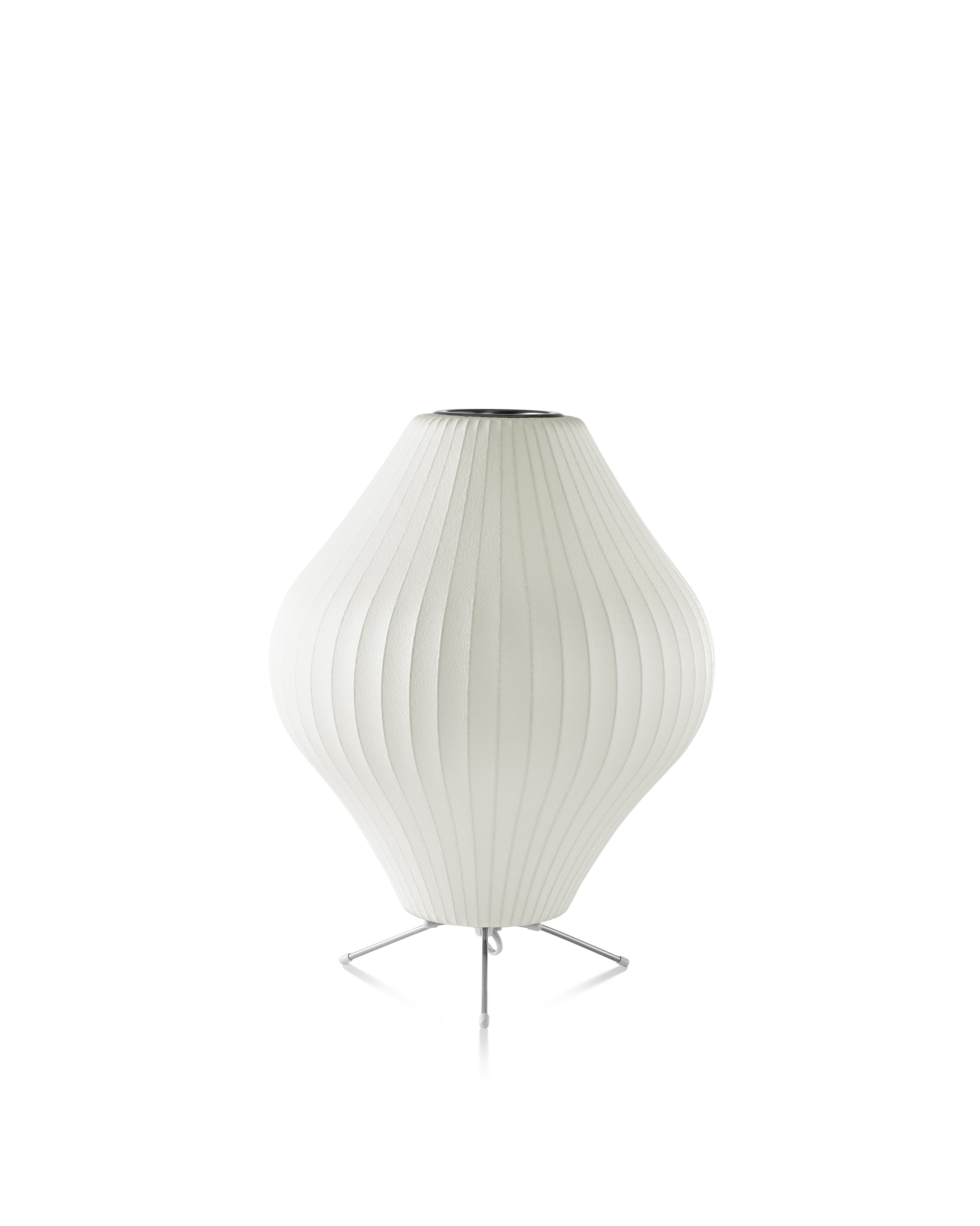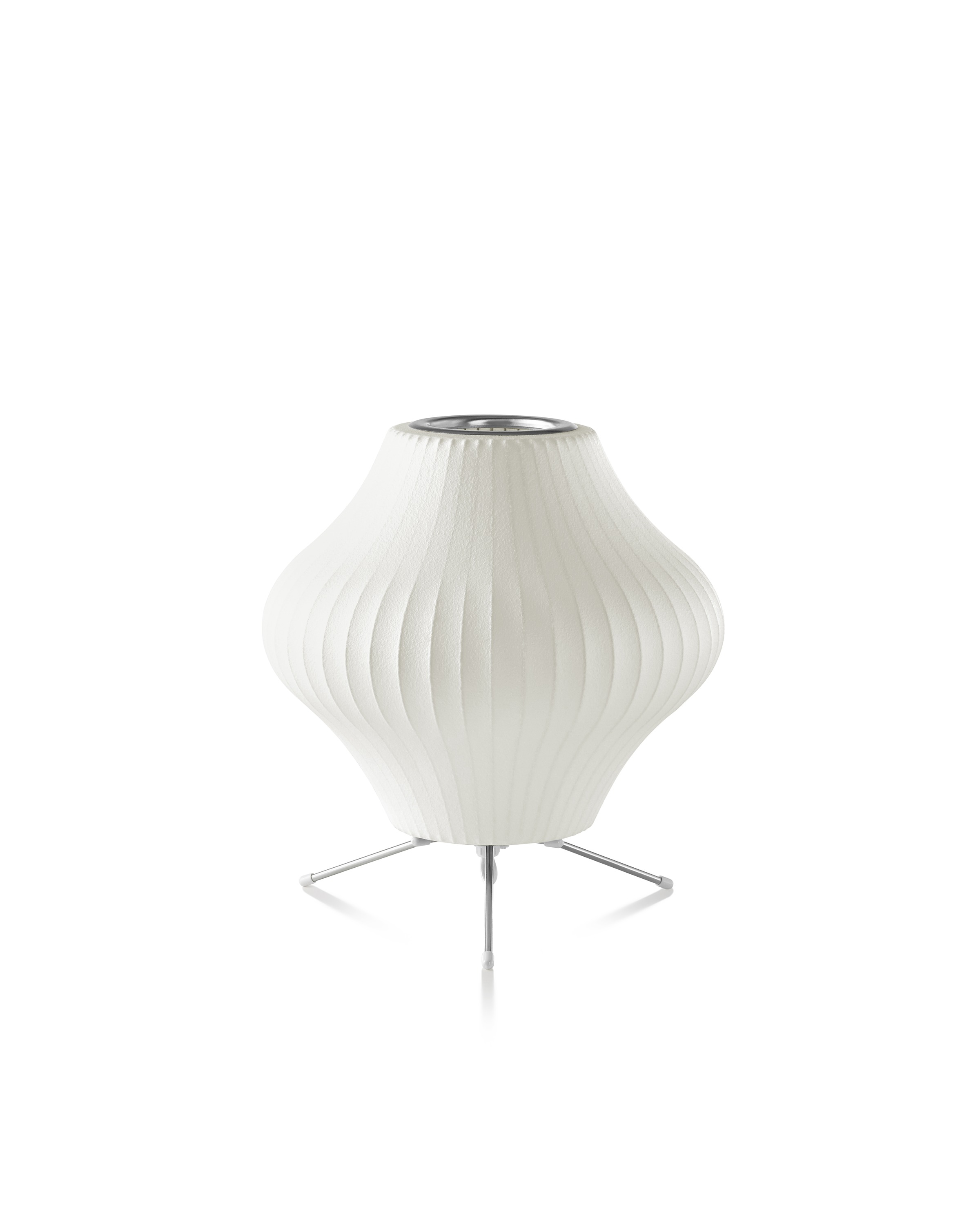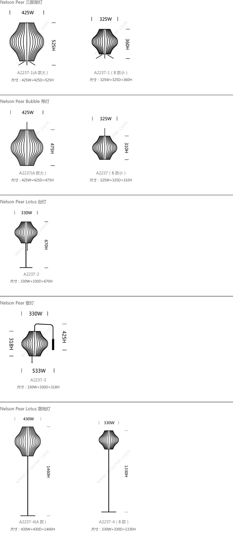 纳尔逊梨三脚架灯有两种尺寸,配有钢制的三脚架支架,可以放置于各种场合,还有方便的7.5英尺的插电线。在迷人的球形轮廓,尼尔森泡灯增加了柔软和亮度的内饰触摸。1952年,美国市场引进了一款瑞典吊灯系列产品,George Nelson对此十分心仪,想要给自己的办公室买一套。那盏灯的价格在当时来讲实在过于高昂,让人望而却步,但却让他萌生出自行设计的念头来。其结果是一系列灯具的面世,这些灯具以一些自然的球状外形为特色,比如圆圆的苹果、加长的雪茄和造型优美的梨等。