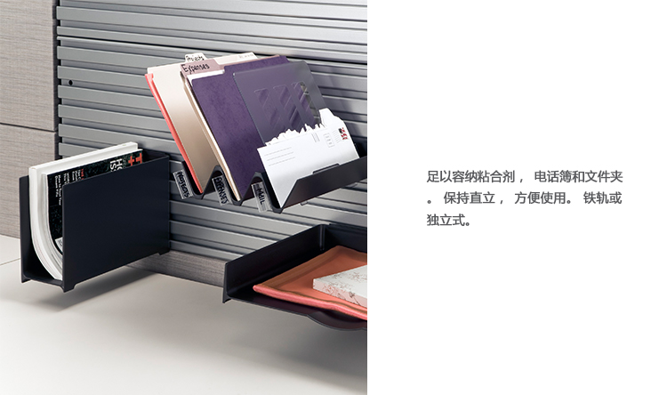 强大到足以容纳活页夹,电话簿和文件夹。保持直立以便于使用。钢轨连接或独立的。