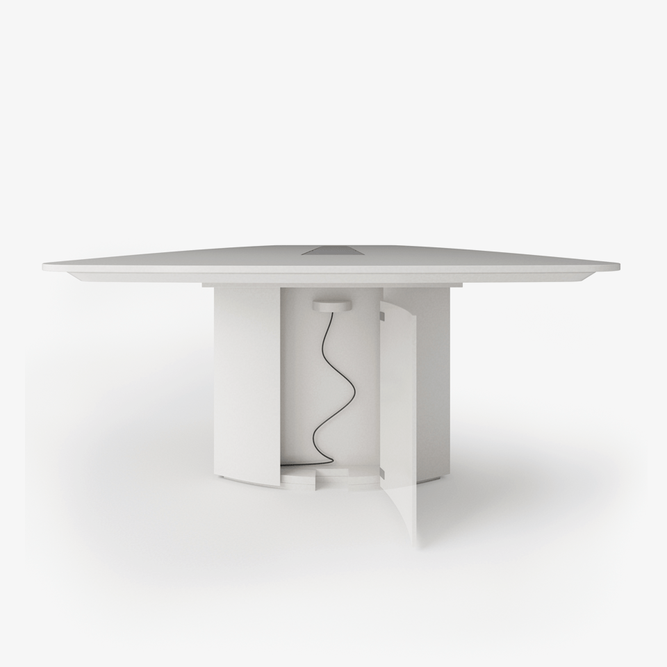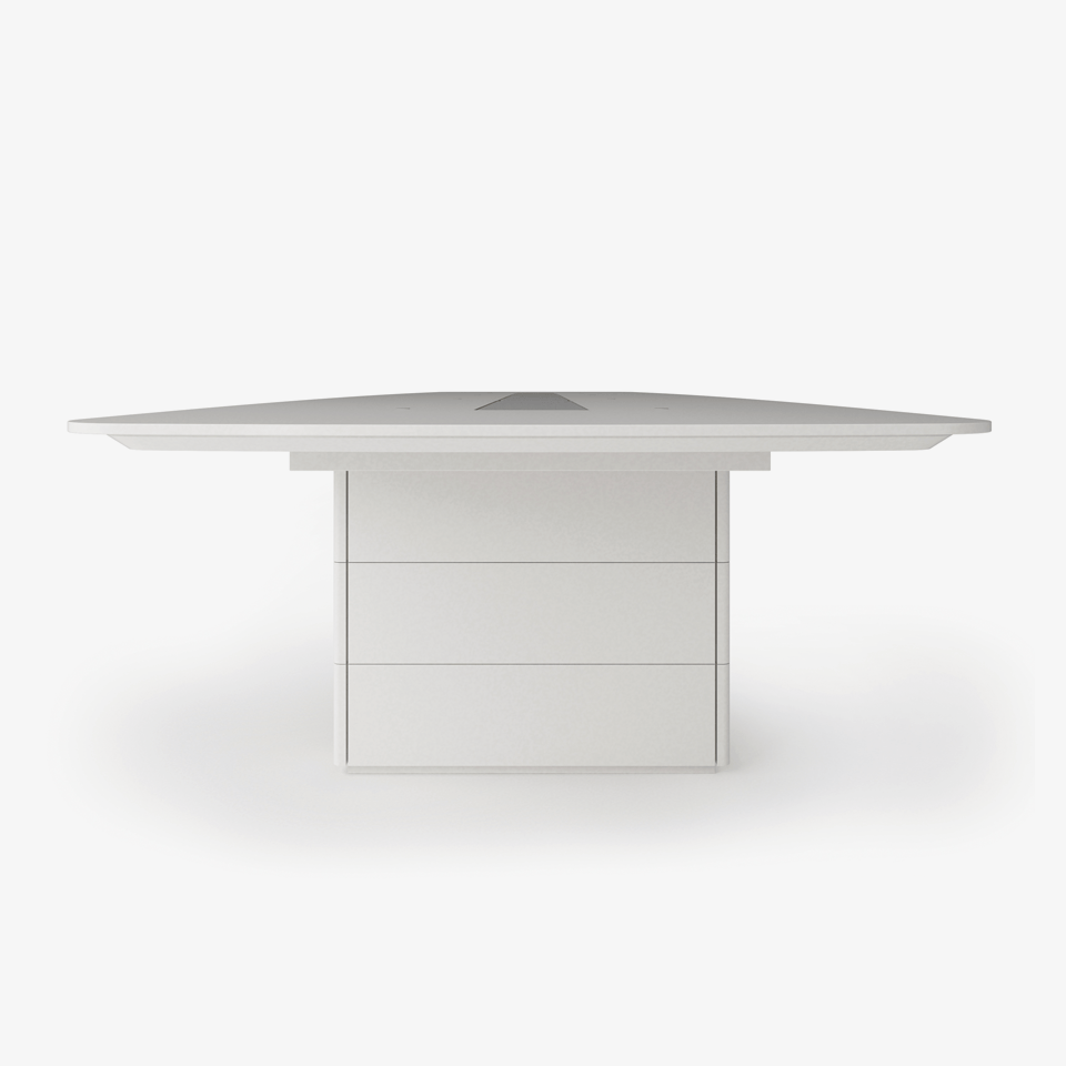 船形或椭圆形为基本形状的高级会议桌。优雅的外形之下,椭圆形、直线形桌腿或整体的桌下机构,可完美收纳走线及隐蔽多媒体设备。中央多媒体槽完美的整合了投影设备和多媒体接口。表面材料可选白色特殊树脂,实木贴面,烤漆和层压板。