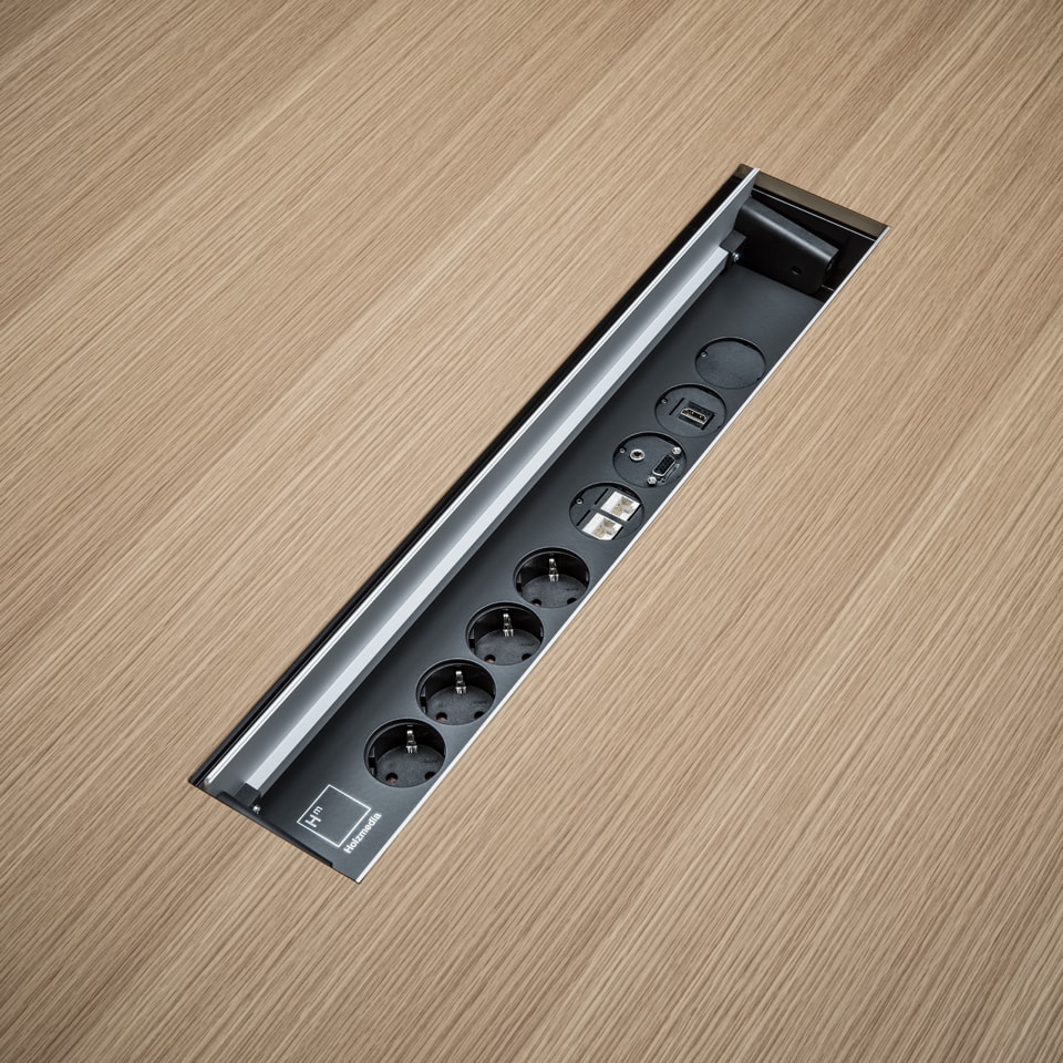 船形或椭圆形为基本形状的高级会议桌,经典椭圆形或长方形脚, 用于隐形电缆布线和技术集成-易于维护.