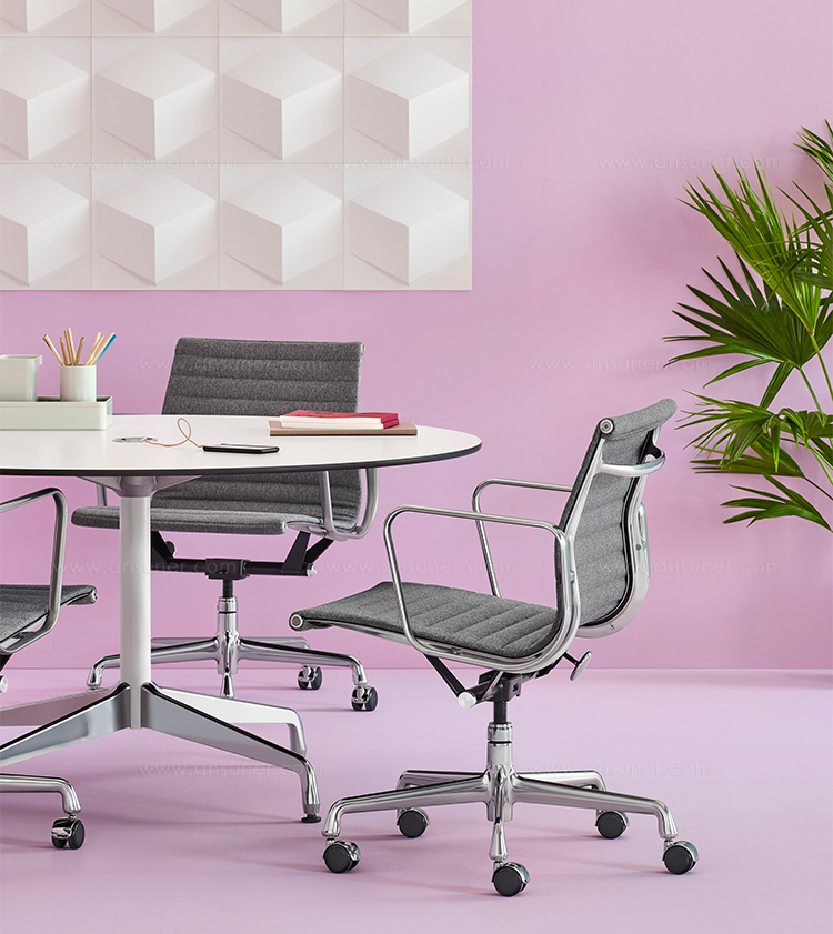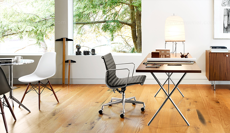Charles与RayEames夫妇是20世纪最有影响力的设计师,卓越的设计涵盖了家具、建筑、影像与平面设计。他们从二次世界大战中美国海军的实验计画中学习经验并发展可谓是现今工业中使用模铸胶合版的先锋,这对设计界的超级夫妇档自1940年参与了由MOMA举办的有机家具设计大赛,自今已有近百件他们的作品被各大博物馆所永久典藏。 Eames® Soft Pad Side Chair(伊姆斯软包会议椅)是夫妻俩1958年设计的,是在全铝系列的基础上发展的另一系列Eames产品。舒适系列在全铝的椅架上增加了皮革制的柔软坐垫和靠背,高级铝合金制作,压模四星脚,可旋转。背垫和坐垫,采用西皮,具有透气性强,内部填充高密度定型绵,不易变形,不老化,依人体坐姿,符合人体工学,耐水及对人体无害等优势。椅子扶手选用优质电镀铝合金扶手,手感舒适,永久不生锈。转椅底盘为多功能底盘,可以保护使用者长时间坐用腿部健康,且作为高度可多定位调节。气压棒采用的气杆是正规厂家出产的外贸气杆,每一根气杆都有钢印,经过严格SGS检测的才可出厂,旋转、升降自如基本无声响,使用寿命长,可承受250kg,可升降数万次,将椅面调至与膝盖同高时,使用者坐下后双脚跟可垂直平放于地上,且大腿与地面平行,最符合人体工学理论,使用者长期久坐,也不想疲惫。办公椅脚为铝合金材质永久不生锈、承受能力强,安全更放心。椅子脚轮采用优质电镀片脚轮,耐用而美观,可以随意变换位置,贴心更方便,具有防震及防松脱,让椅子的安全性能更加可靠。