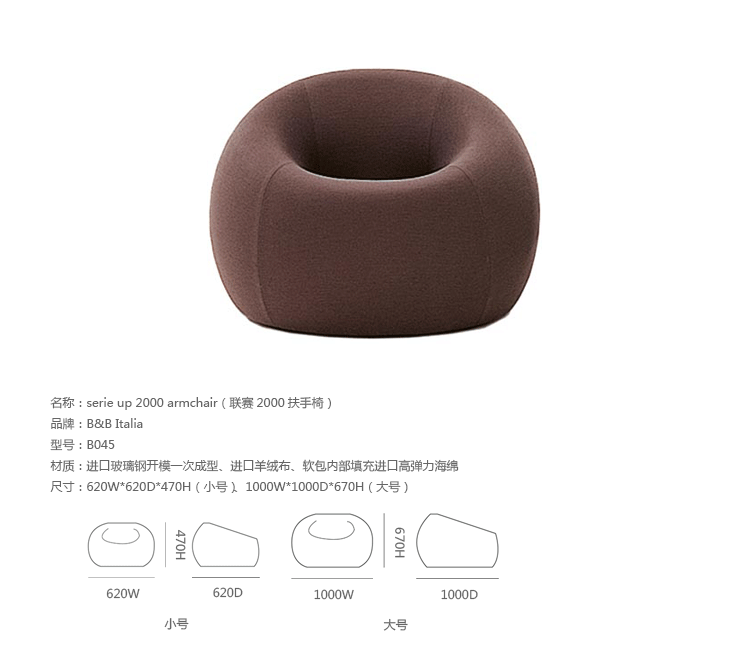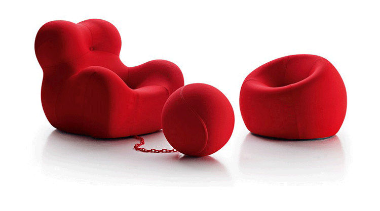 自从Up系列1969年面世以来,就成为一款最杰出的设计。此系列七款大小不一的坐具给人们以非凡的视觉冲击,让它们显得与众不同。Up5是此系列中最著名的一款,一个像女人的坐具与一个球形的脚凳连在一起,似乎要让女人屈服。其由意大利著名设计师Gaetano pesce设计,外形模仿女性性感的曲线轮廓,而且为了让使用者坐在上面能感受到超级舒服的感觉,特意将性感曲线的各个部位都加以放大。目前有UP5与UP6两种型号,适用不同体型的人。