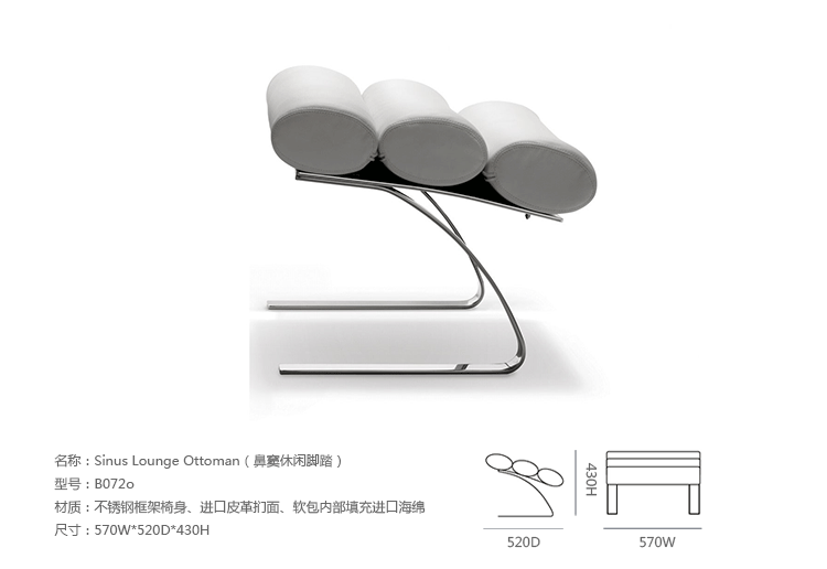 Reinhold Adolf & Hans Jurgen Schropfer为德国著名家具公司Cor设计了一款名为鼻窦系列的家具,这系列家具包括Sinus Lounge Chair(鼻窦躺椅)、Sinus Lounge Ottoman(鼻窦休闲脚踏)及其组合Sinus Lounge Chair and Ottoman(鼻窦躺椅&脚踏)。躺椅造型就像一只只圆形的鼻窦组合在一起,材质是不锈钢框架椅身、进口皮革扪面、软包内部填充进口海绵,躺着上面非常的抒情惬意。