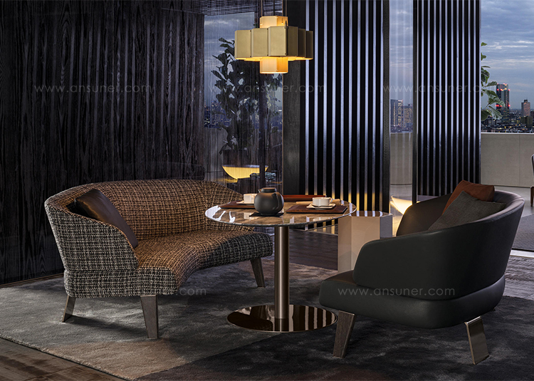 Creed “Lounge”沙发后方的地面支撑采用做工考究的弯曲金属架并搭配浅铜色亮光漆,前方支撑腿则为米灰色的鲍迪豆实木材质。支撑腿的上下方均采用精致的金属部件并搭配浅铜色亮面漆,用与众不同的细节设计来展现非同寻常的高超工艺。