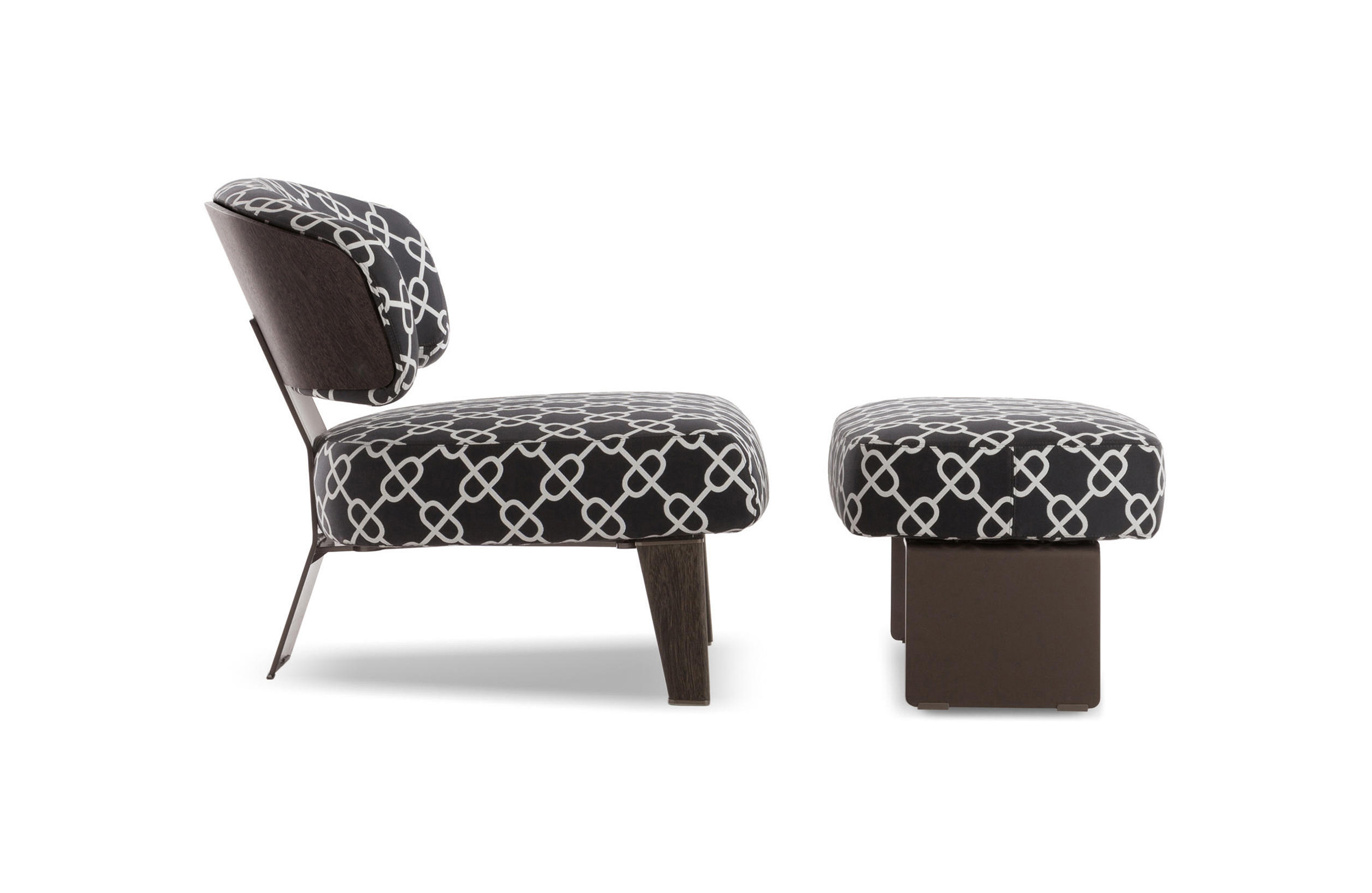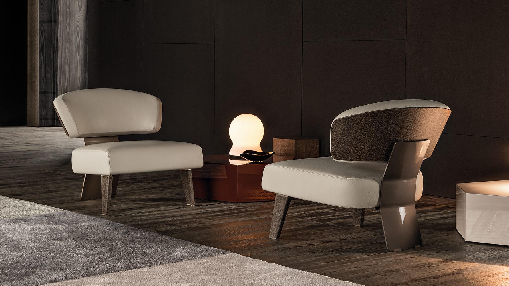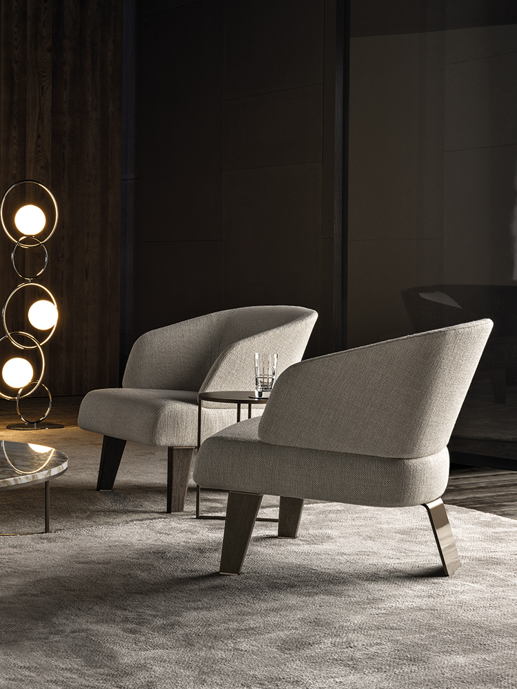 Creed “Lounge”沙发后方的地面支撑采用做工考究的弯曲金属架并搭配浅铜色亮光漆,前方支撑腿则为米灰色的鲍迪豆实木材质。支撑腿的上下方均采用精致的金属部件并搭配浅铜色亮面漆,用与众不同的细节设计来展现非同寻常的高超工艺。