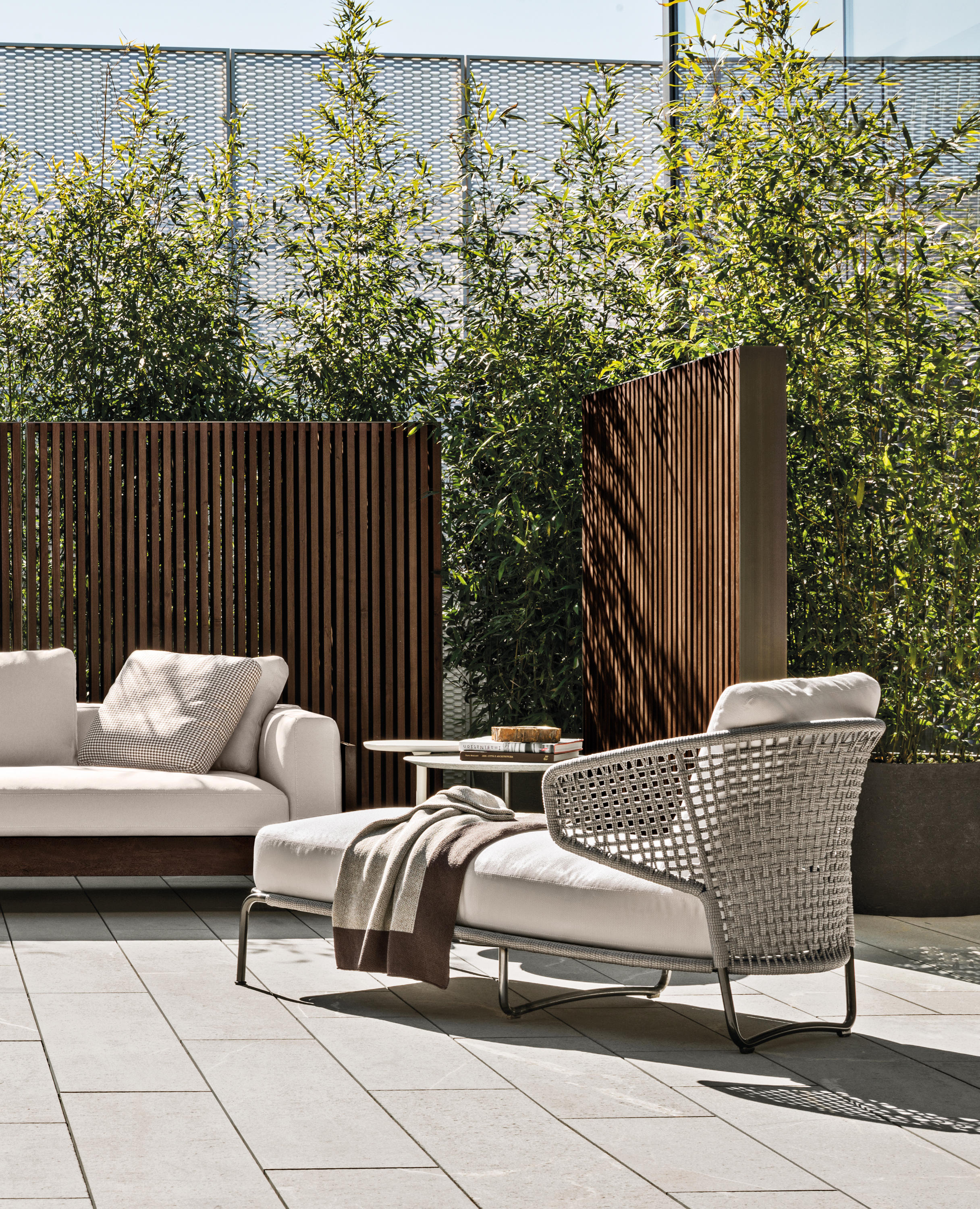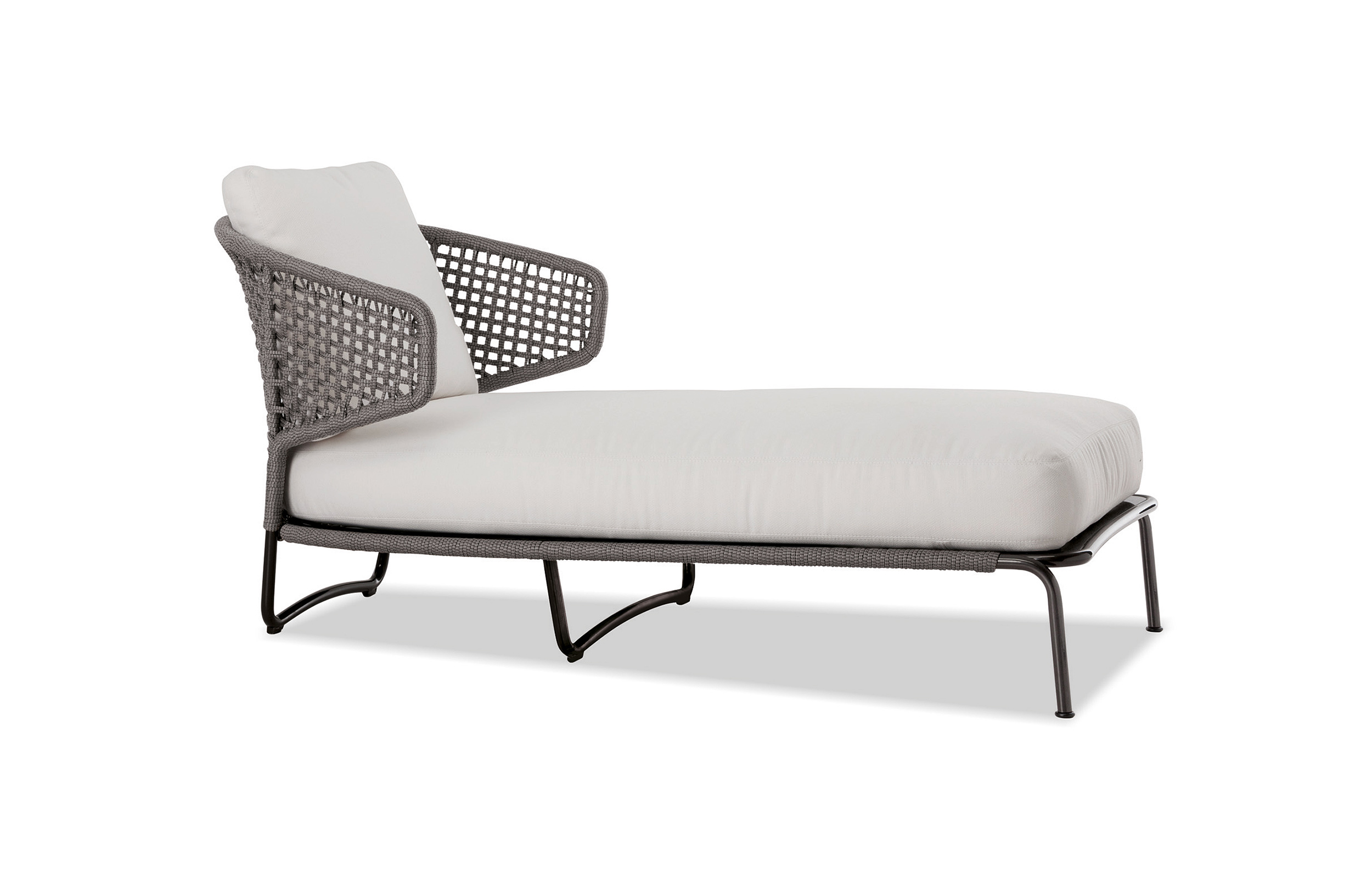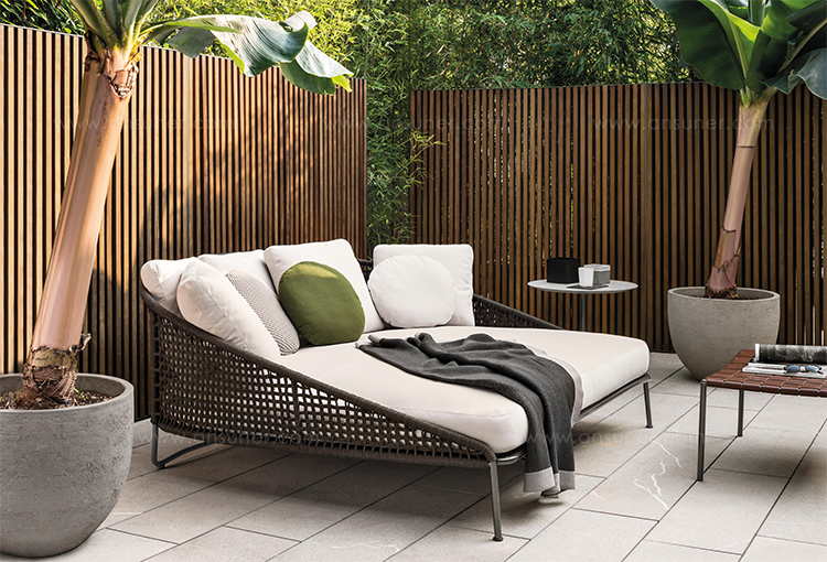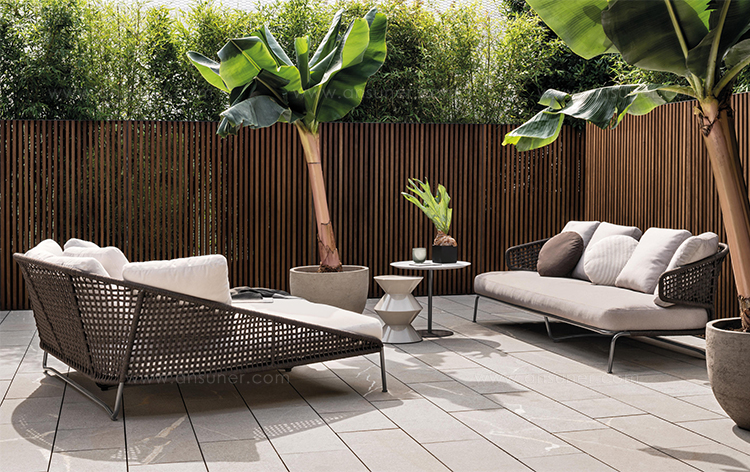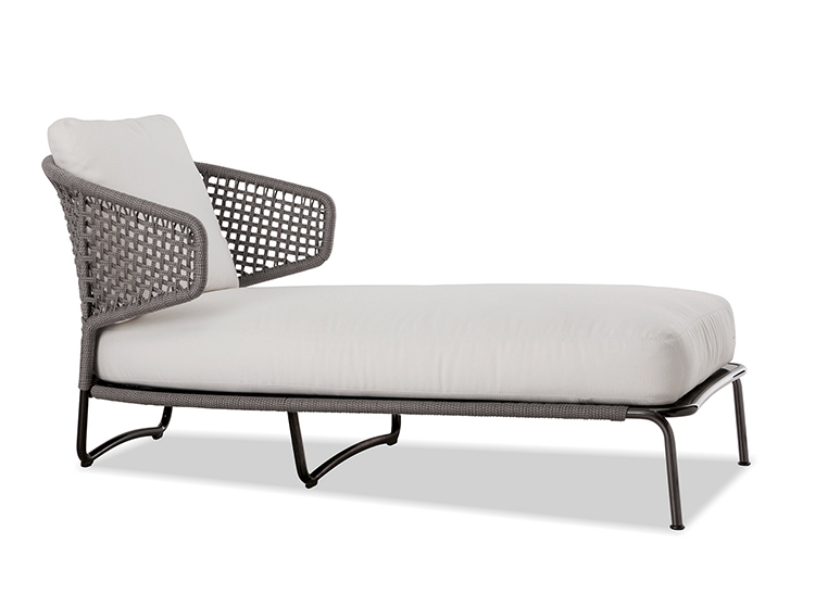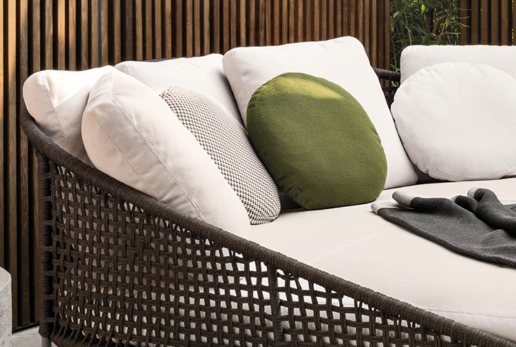 Aston是一个单品家族系列,其中包括沙发、沙发床、扶手椅、脚凳、座椅,为家居环境和“共享空间”提供优雅而时尚的装饰,在室内和室外皆可应对自如。阿斯顿“绳”户外系列采用金属材质的构架,搭配Pewter色聚酯漆面,部件都针对户外环境而经过特别处理,覆面采用疏水性纤维面料。靠背采用直径为7毫米的特殊聚丙烯纱线编织而成,两种颜色可供选择:浅灰色和深棕色,与全新Art Lifescape 02系列的面料和Alison “Dark Brown”户外系列的色调相得益彰。针对户外环境的特点,金属构架经过特别处理,搭配Pewter色聚酯漆面,覆面采用特殊聚丙烯纱线编织而成,有两种颜色可供选择:浅灰色和深棕色。坐垫采用Minotti Studio独家设计并通过激光加工而成的几何装饰。靠垫的内部填充物是高弹性聚氨酯泡沫,覆面采用疏水性纤维面料。