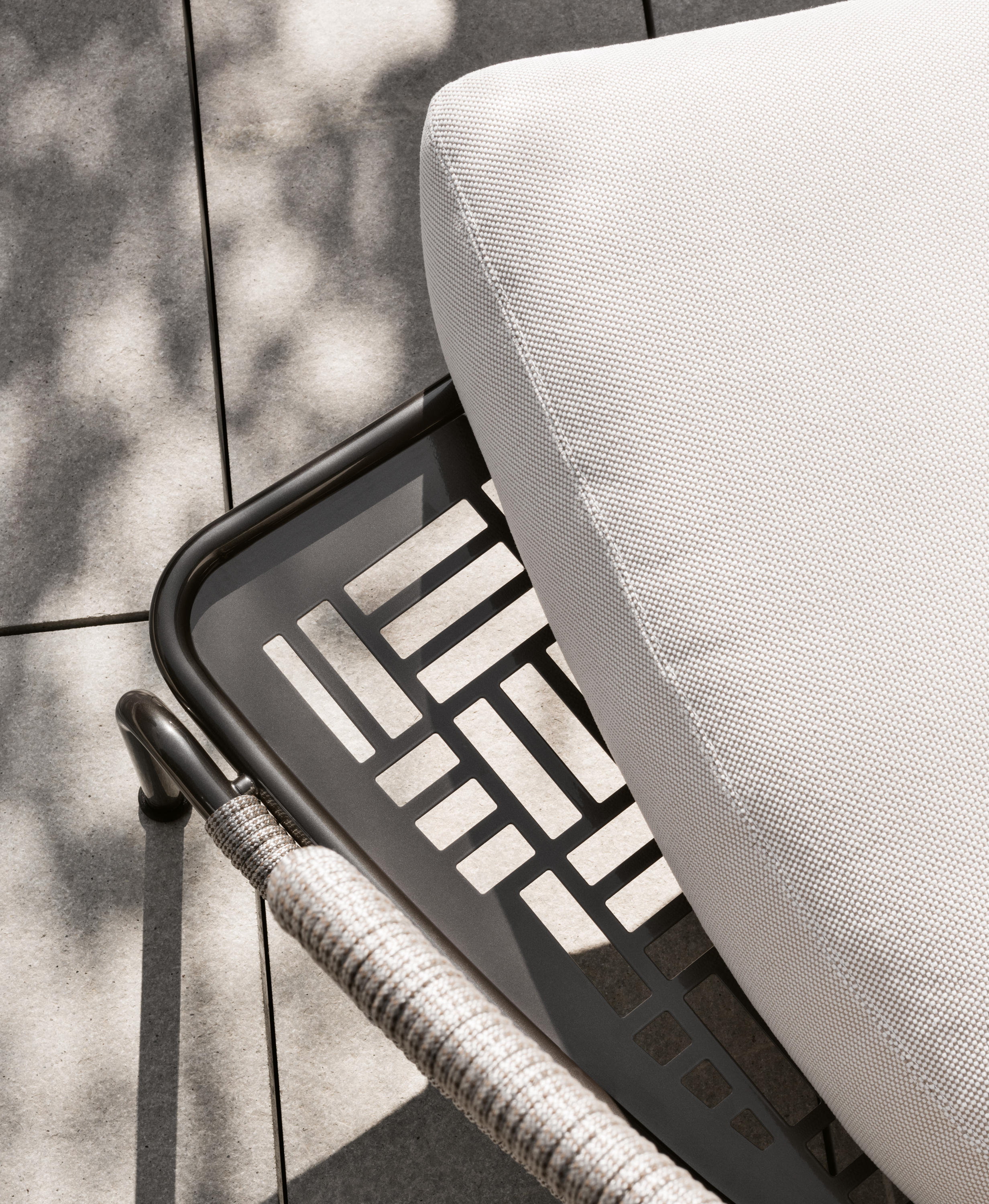 Aston是一个单品家族系列,其中包括沙发、沙发床、扶手椅、脚凳、座椅,为家居环境和“共享空间”提供优雅而时尚的装饰,在室内和室外皆可应对自如。阿斯顿“绳”户外系列采用金属材质的构架,搭配Pewter色聚酯漆面,部件都针对户外环境而经过特别处理,覆面采用疏水性纤维面料。靠背采用直径为7毫米的特殊聚丙烯纱线编织而成,两种颜色可供选择:浅灰色和深棕色,与全新Art Lifescape 02系列的面料和Alison “Dark Brown”户外系列的色调相得益彰。针对户外环境的特点,金属构架经过特别处理,搭配Pewter色聚酯漆面,覆面采用特殊聚丙烯纱线编织而成,有两种颜色可供选择:浅灰色和深棕色。坐垫采用Minotti Studio独家设计并通过激光加工而成的几何装饰。靠垫的内部填充物是高弹性聚氨酯泡沫,覆面采用疏水性纤维面料。