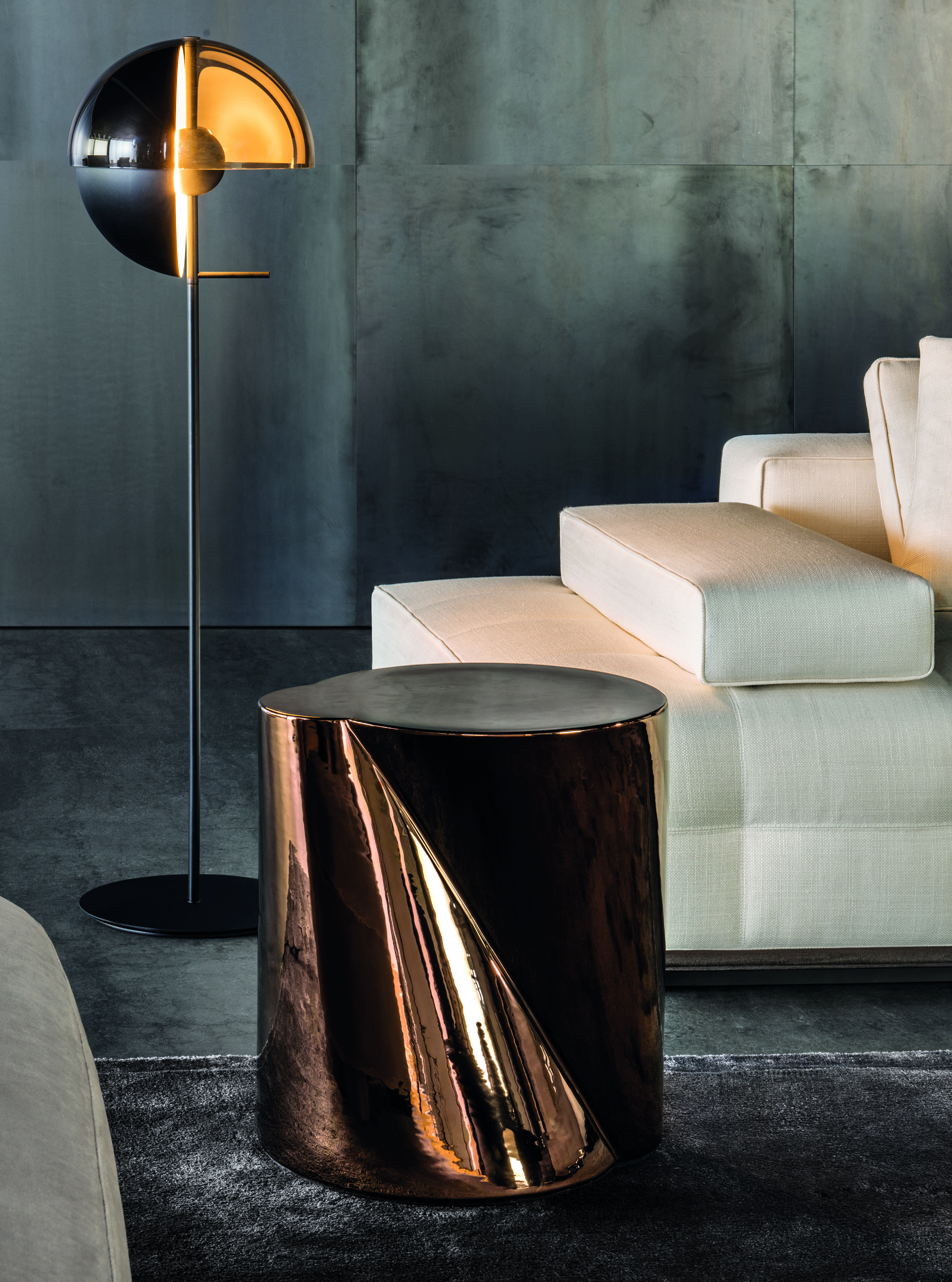 两个锥体连接在一起,打造出造型别具一格的边几,与此同时,两种金属饰面也体现出这款产品的非凡气质:铜色和铂金色。在经过玻璃化的工序之后,陶瓷还要经过进一步烧制,以此来熔化釉面的金属。