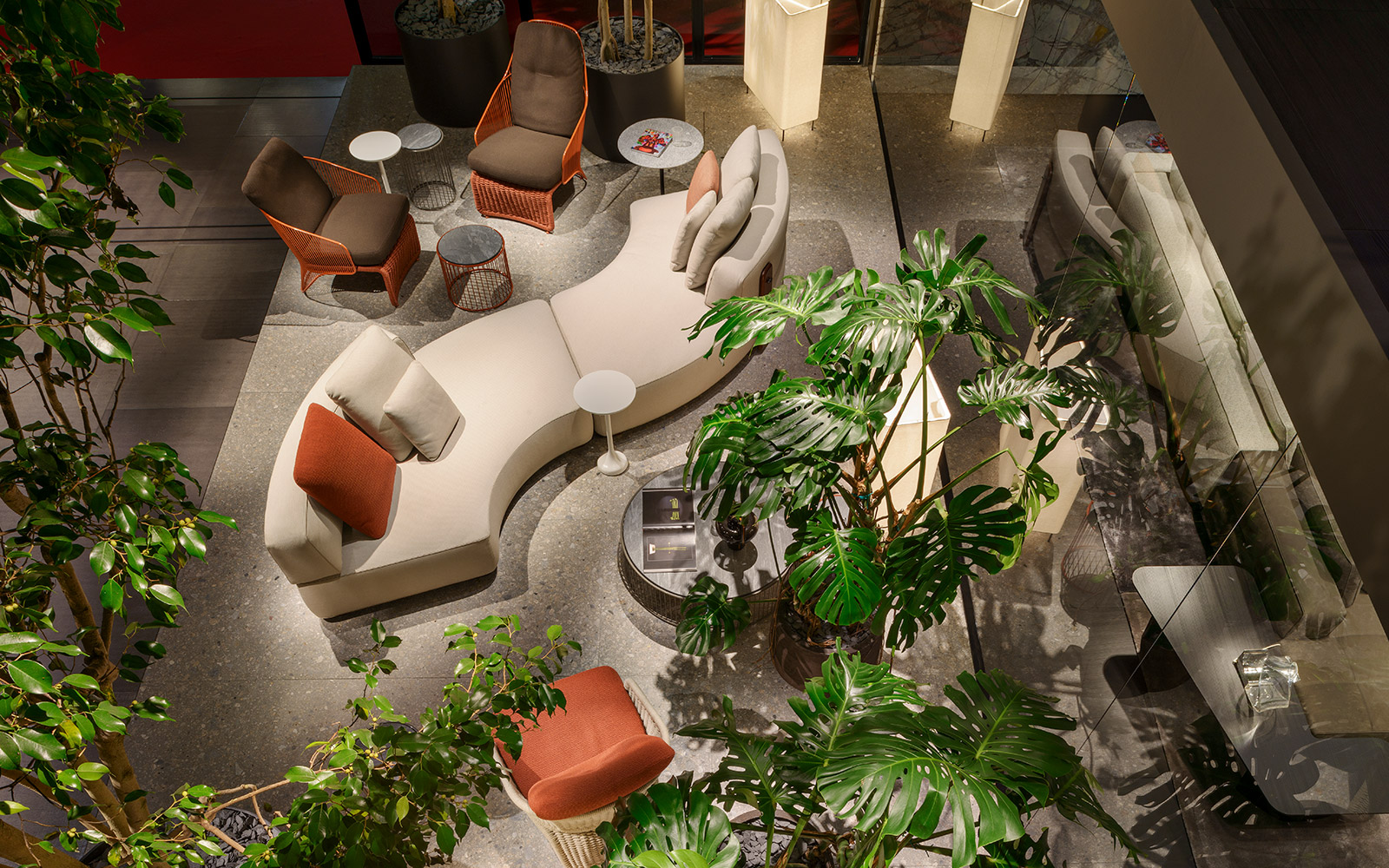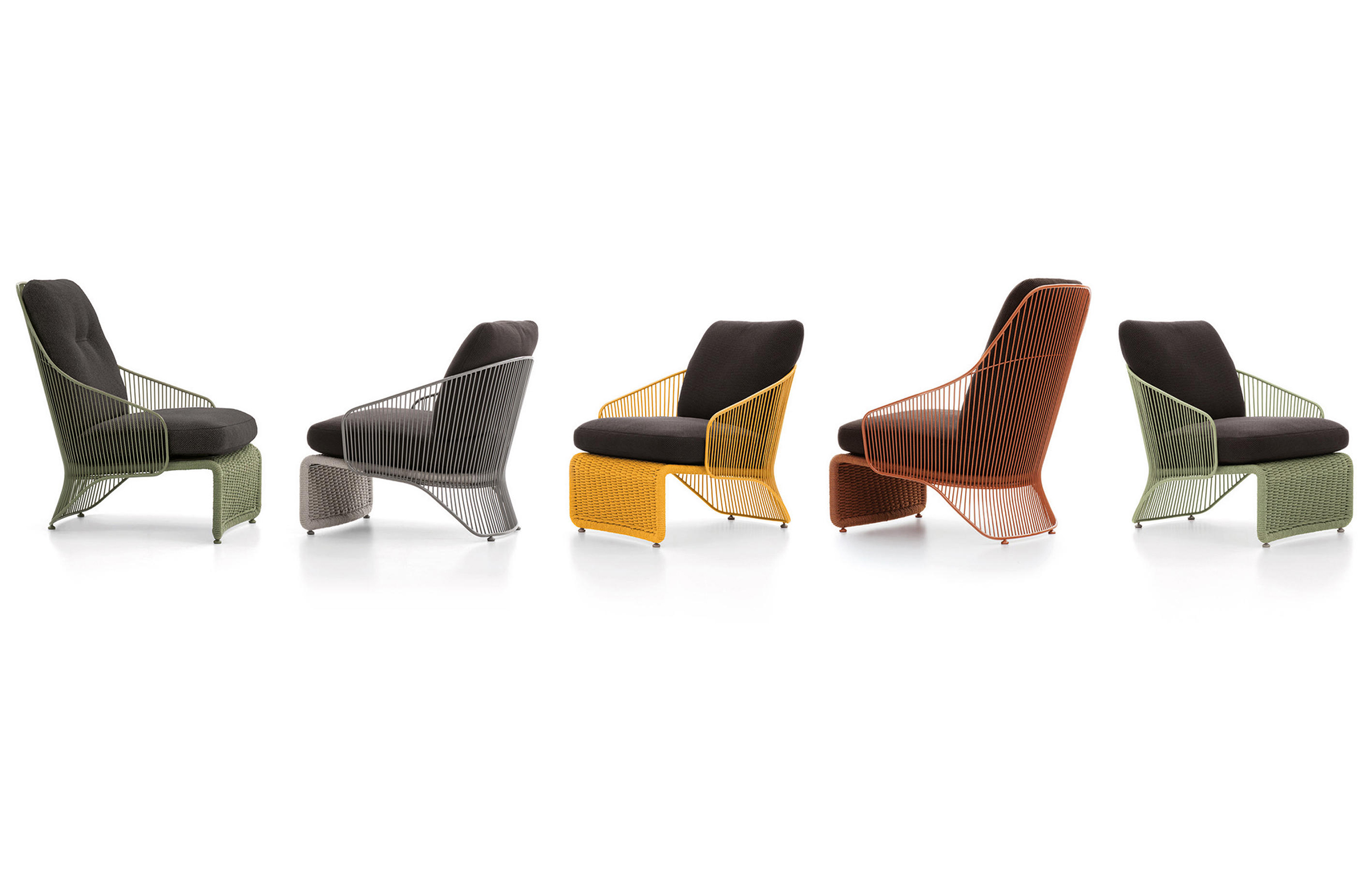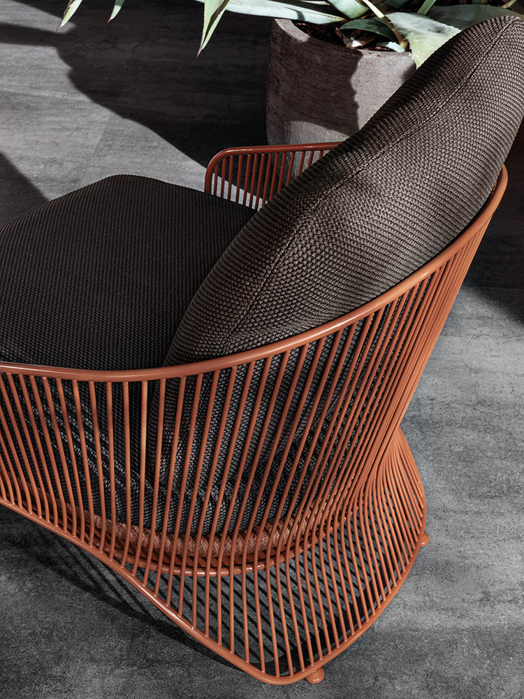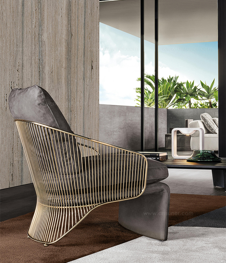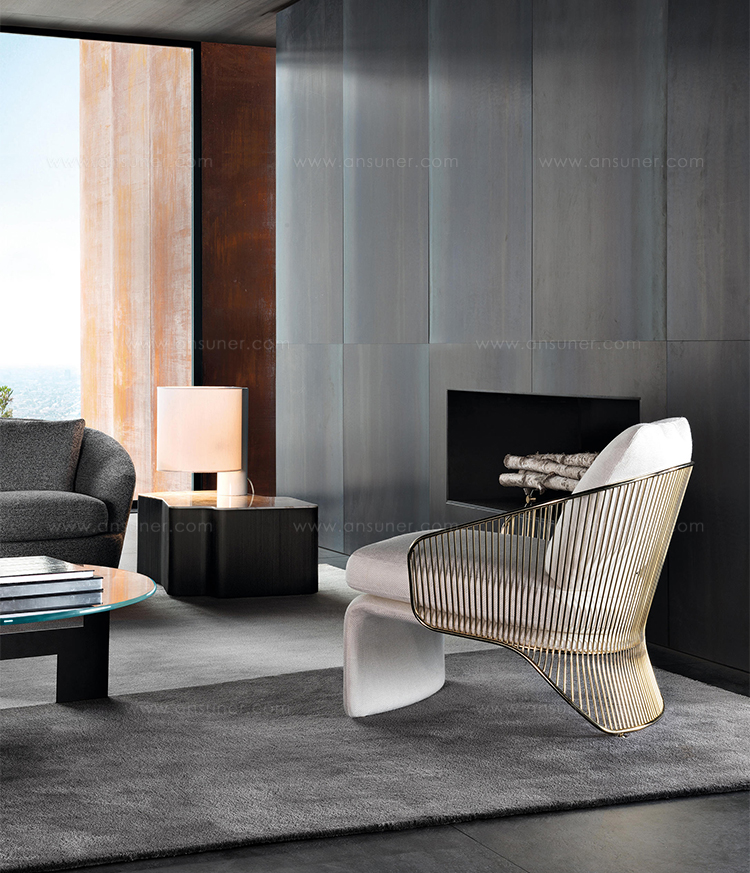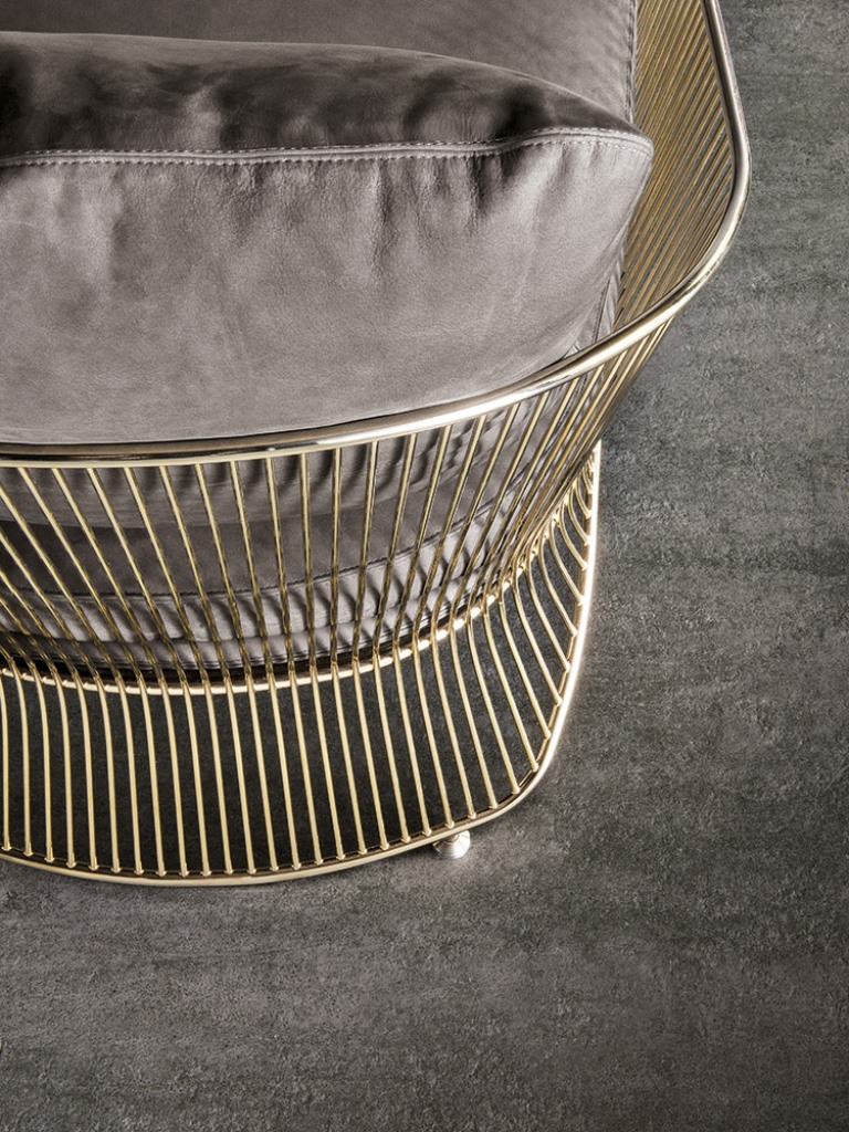 Colette扶手椅的制造过程相当复杂。外部的金属构架经过压延和装配,焊接点超过三百个。特殊的金属表面源于在淡金色的液池中进行电镀的工序以及透明的保护涂层,在此基础上拥有刚度和深度。座椅结构前方搭配地面支撑件,采用聚氨酯泡沫制成,内部插入金属件,绑带的设计使其具有一定的弹性,从而保证绝佳的舒适度。 坐垫和靠背完美搭配构架的设计。