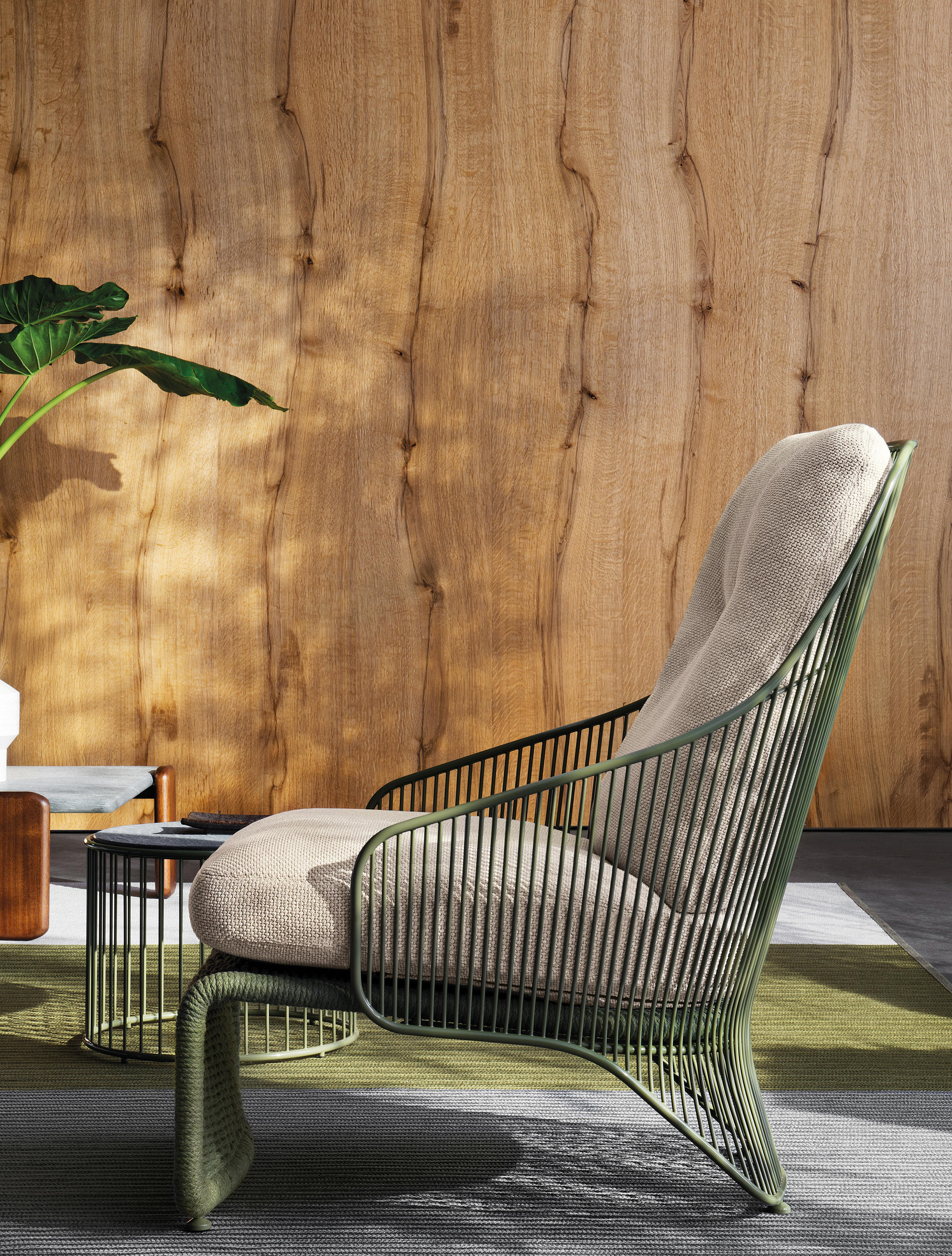 这款扶手椅十分引人注目,充满上世纪中叶的优雅气质,那一时期的产品将实验性的造型设计与精致的装饰风格完美融合在一起。