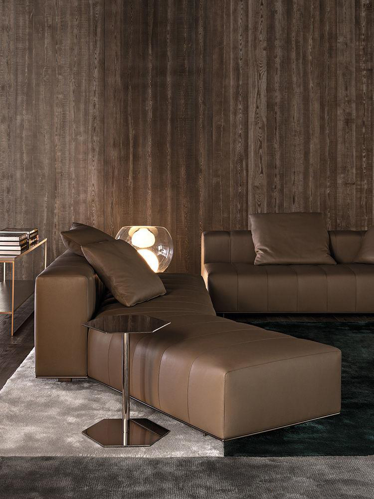 弗里曼“裁缝”项目的理念和原创性在其衍生系列弗里曼“休息室”中也有所体现。弗里曼“休息室”沙发纵深度有所降低,不仅更易搭配较小的居住空间,还可以用在接待场所,如等候室、前台区域、行政办公室。单组沙发的特点在于采用规则图形纹样的优雅缝线设计,可以自由随性地组合沙发,打造灵动的造型。“Wing”扶手拥有轻盈的线条,这要得益于采用聚氨酯为基材的泡沫金属框架。精致的包覆材料展现出公司运用复杂面料进行剪裁加工的实力。皮革和织物面料的各个部件通过浅铜色人造皮革束带和双缝线工艺连接在一起,打造出独特的纵深效果。