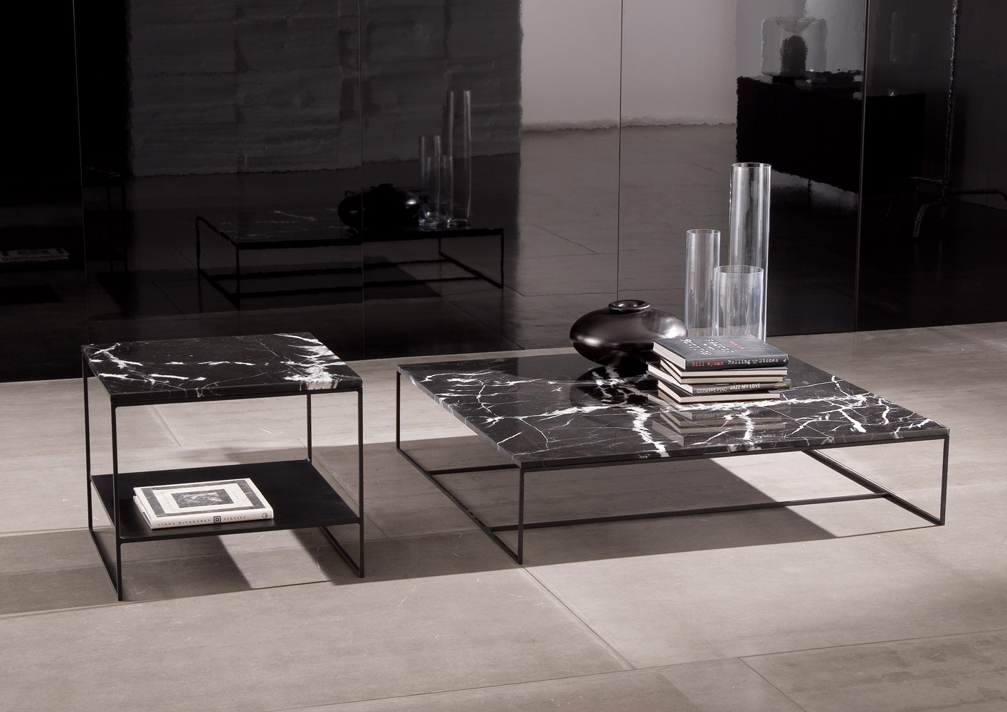 Calder家族有各种尺寸的边几和边桌,这一组全新的设计方案为其带来更为清新时尚的造型。铁架结构如今采用亚光浅铜色的表面。桌面也推出新版本:Sand色亮漆,米灰色的鲍迪豆木饰贴面,Bardiglio Nuvolato和Calacatta的大理石。中间层的桌面也为亚光浅铜漆面的金属。