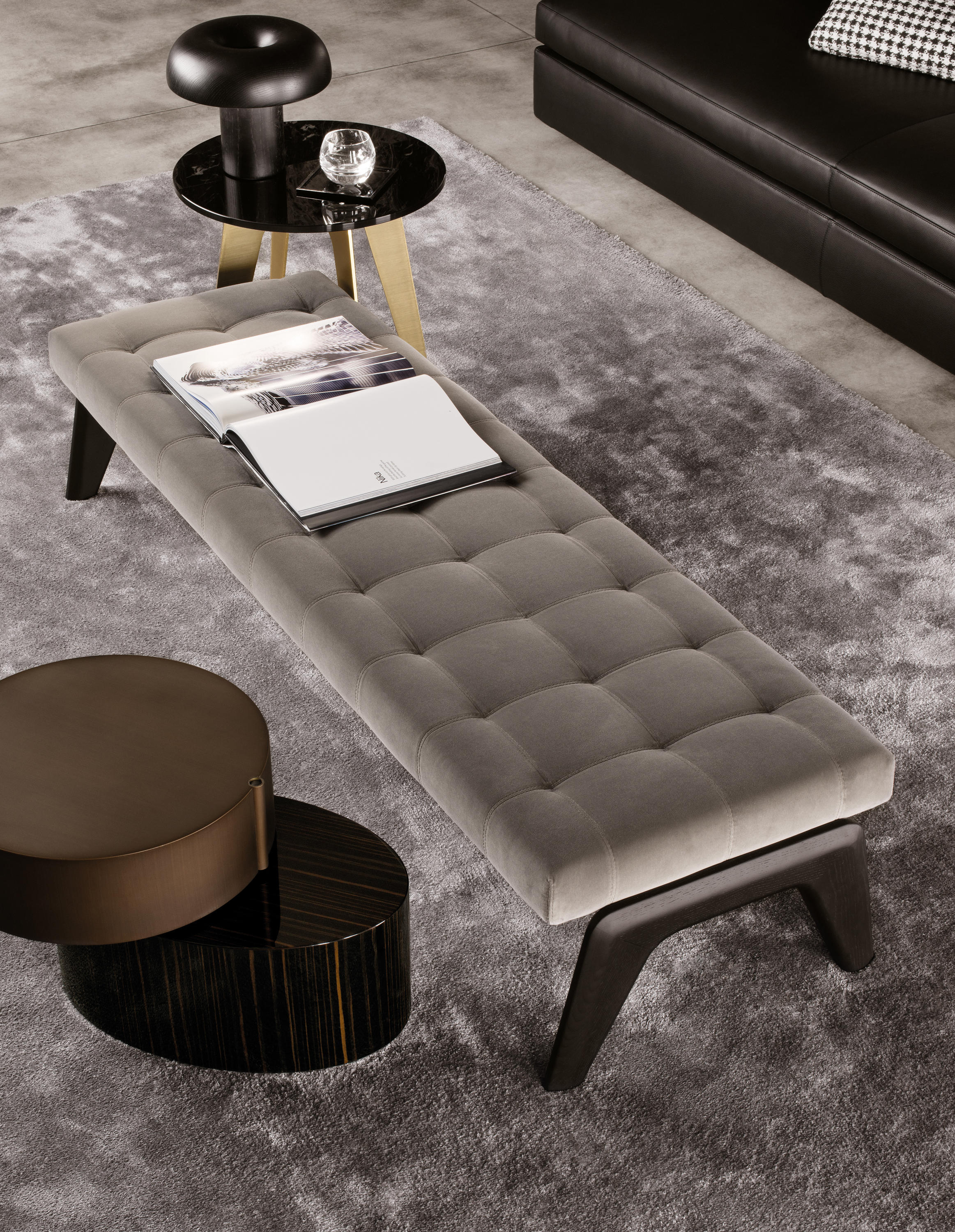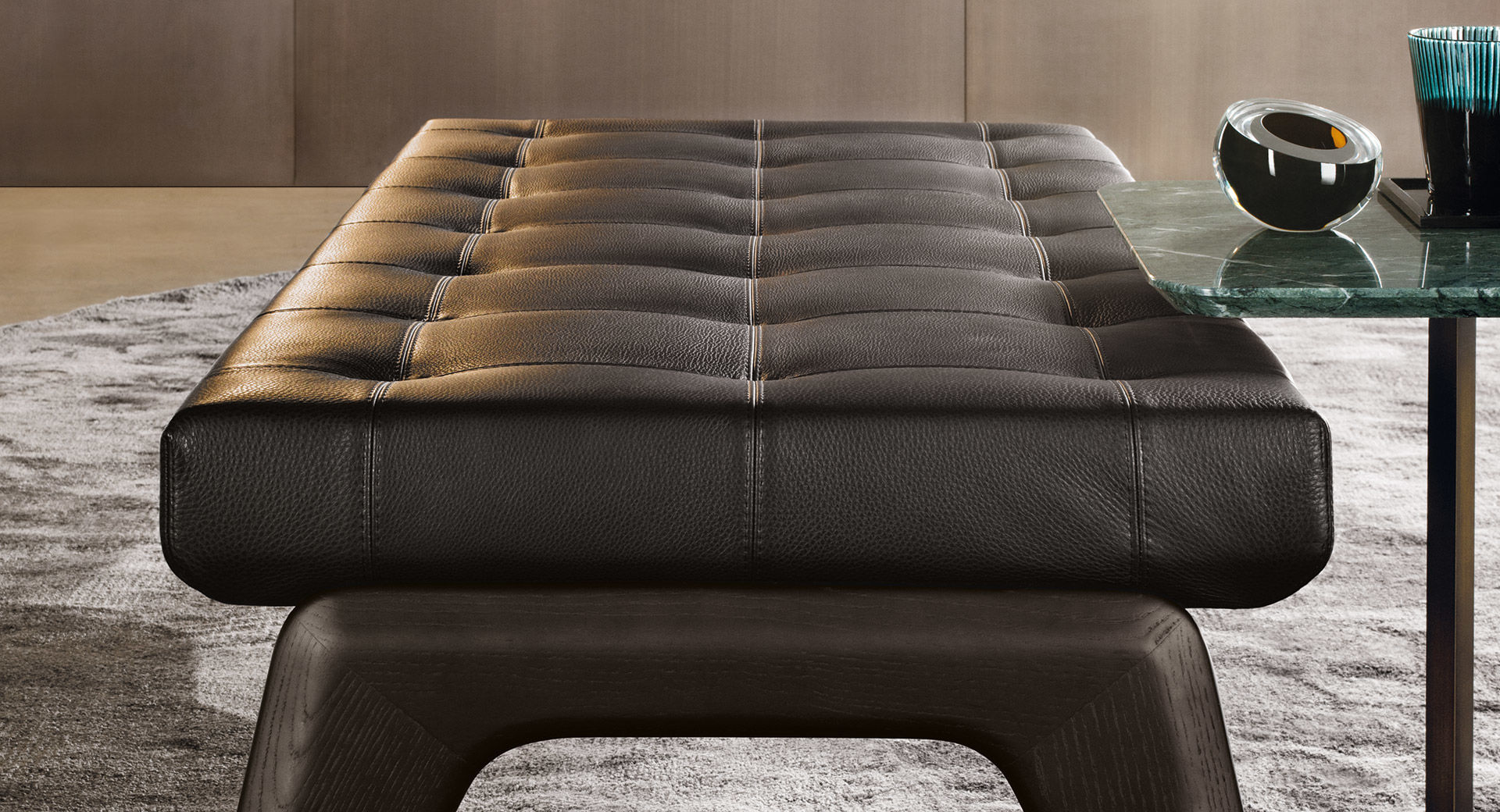 以精美梣木底座致敬传统黑檀木艺术,搭配拥有圆滑转角与柔和饰边的光泽漆面黑檀木、黑色脱蜡琉璃及 Marron Damasco 大理石台板。