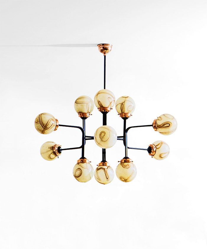 Ziron是一款完全手工制作的枝形吊灯,灵感来自古董手工制作的眼镜,不再生产。 每个手工吹制的玻璃穹顶都是独特的,具有不同的图案,但是以优雅的方式相互协调。 黑色涂漆的金属片弯曲并连接在一起,从而形成枝形吊灯的臂。 结合抛光铜,Ziron是一款现代吊灯,给人一种怀旧的感觉。