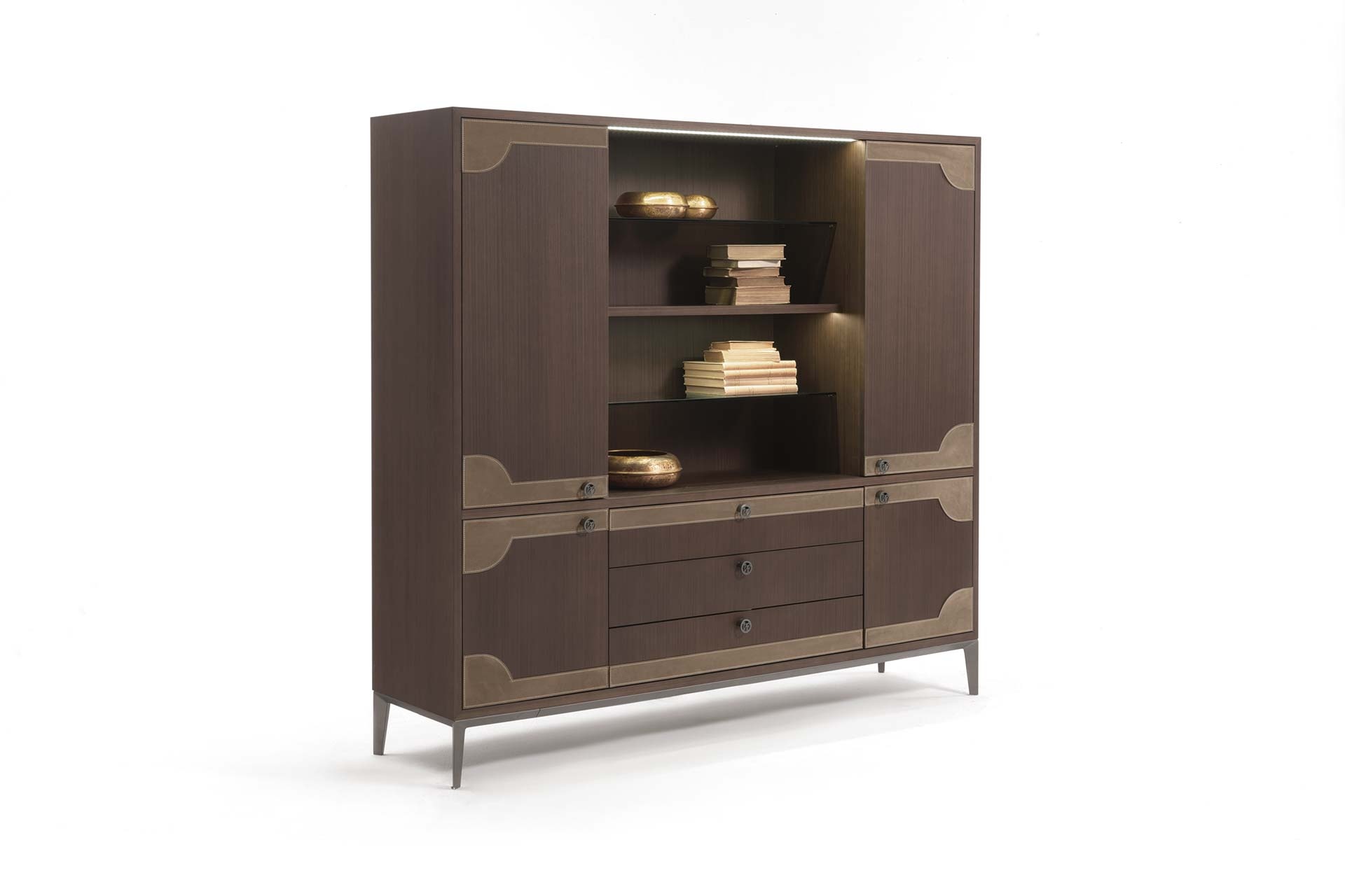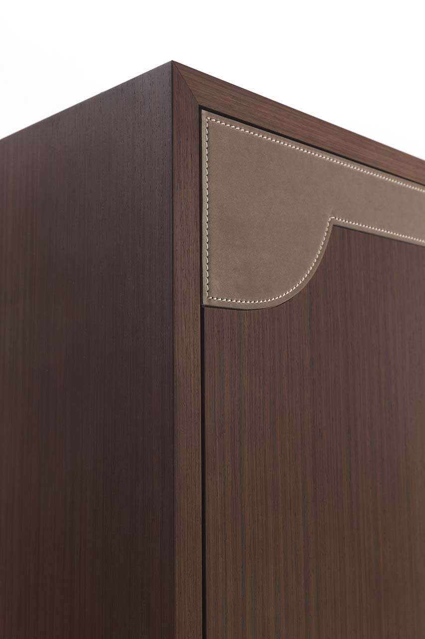 客厅集合项目的特点是精致的牛皮插入,几乎嵌在乌木