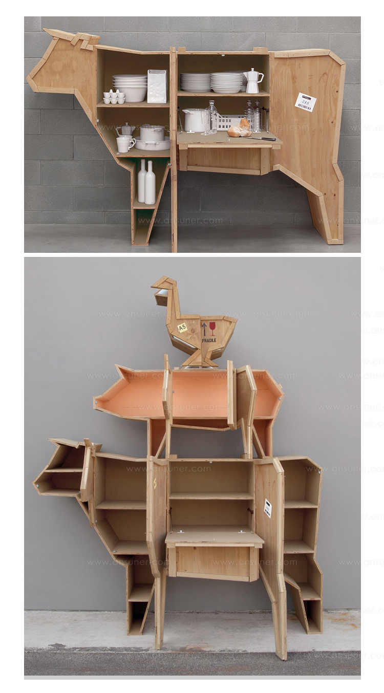 讽刺是一件严肃的事情,如果在微笑的同时让我们思考。动物板条箱协会很有趣,但同时也让我们对人类与自然的关系感到敏感。这件家具作品代表了一种荒谬的形象,动物们被运来运去。可能吗?为了更好地表达这个概念,我们选择了三种典型的农场动物,一头牛,一头猪和一只鸭子。每一个可见的瑕疵都是这件作品的特色,为了尊重原作的诗意,这些作品都是用同样的工艺制作而成,用于真正的运输板条箱。