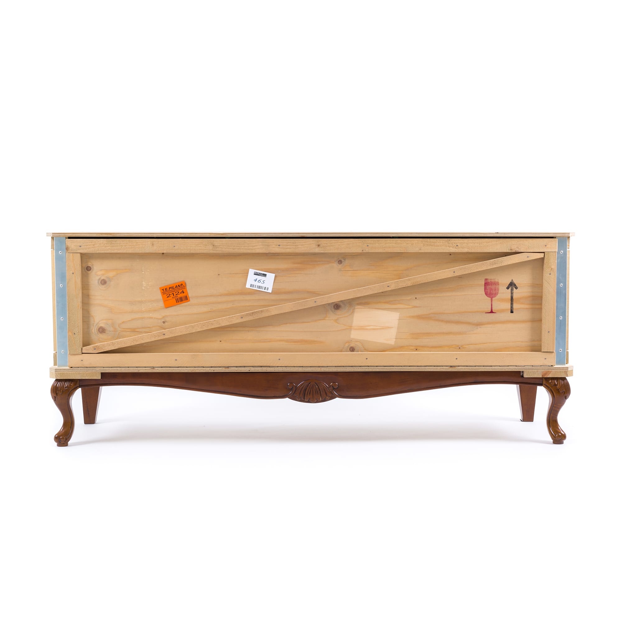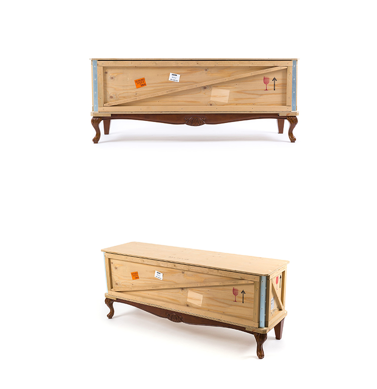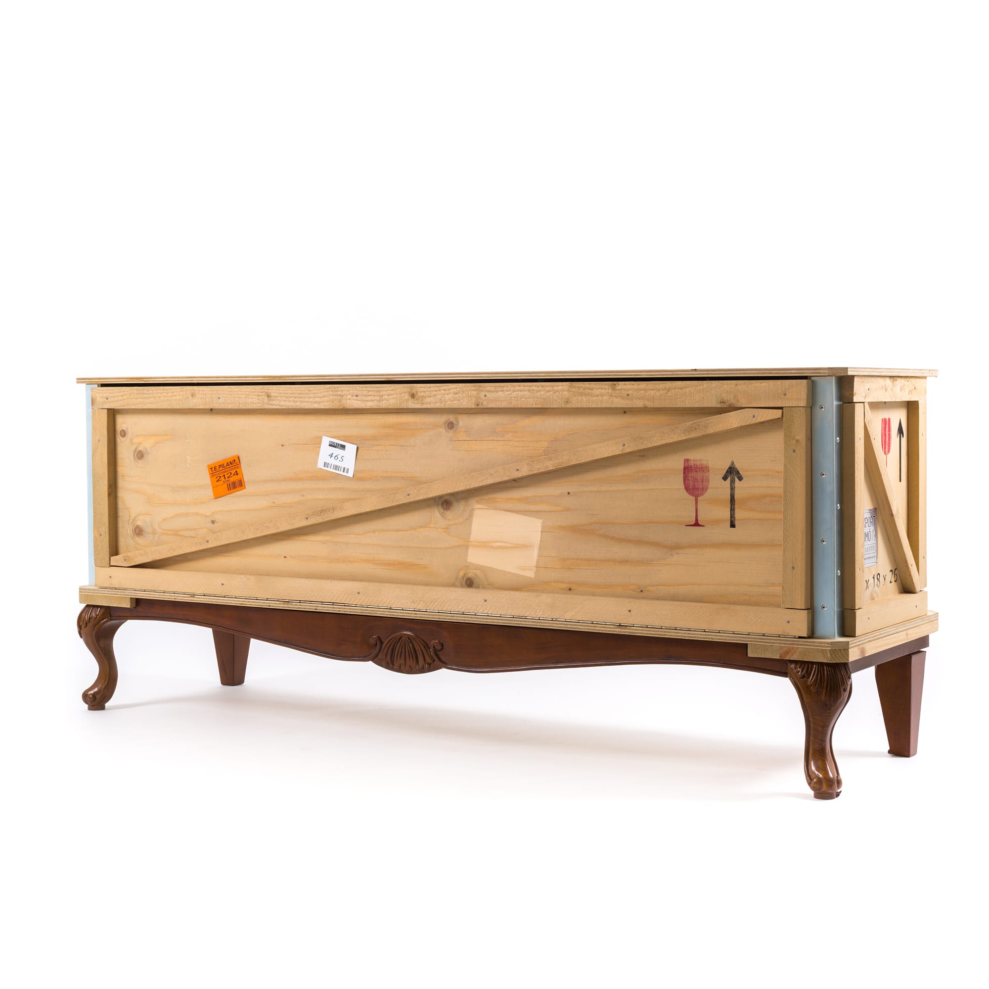 Designed by Marcantonio Raimondi Malerba for Seletti, this modern bedside table blends two different styles in one quirky design. A packing case boasting various labels and signs is paired with ornate Louis XIV legs. The bright green interior features one shelf and two storage spaces. Handmade from solid wood, this Export Como Bedside Table is as impressive in its durability as it is in its distinctive design. It can be used on its own to create a focal point in a bedroom or alongside other pieces of furniture from the Export Como collection. Made in Italy.
