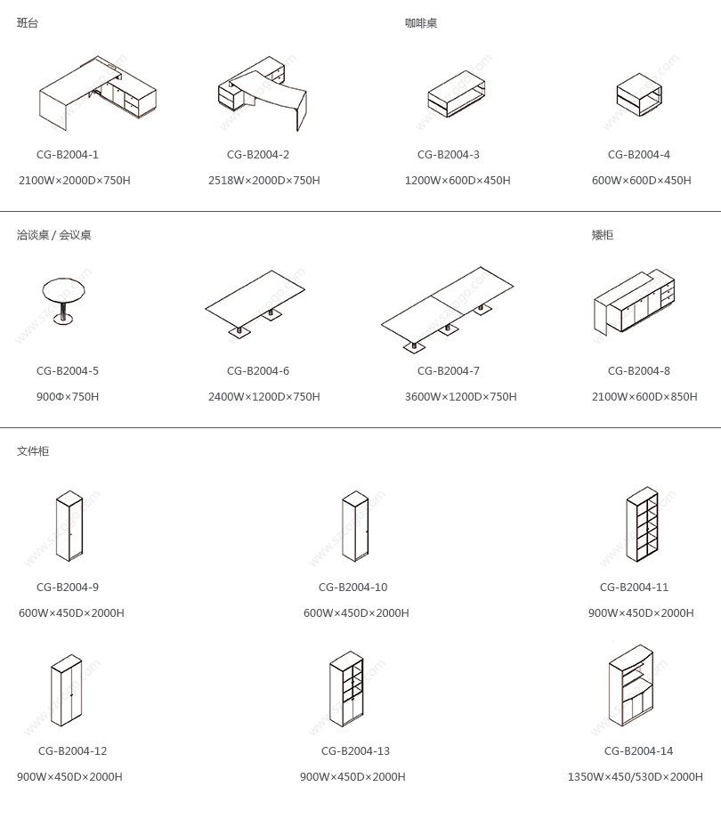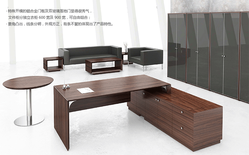 Rain系列秀气、小巧,适合中小型办公室及家庭书房实用。文件柜有双木门、上玻下门等等几个产品,可以按照办公室及房间尺寸任意组合。会议台采用圆形钢脚配方形底座,与产品的细线条融为一体。