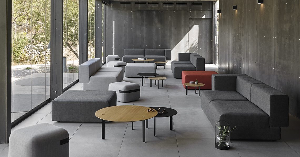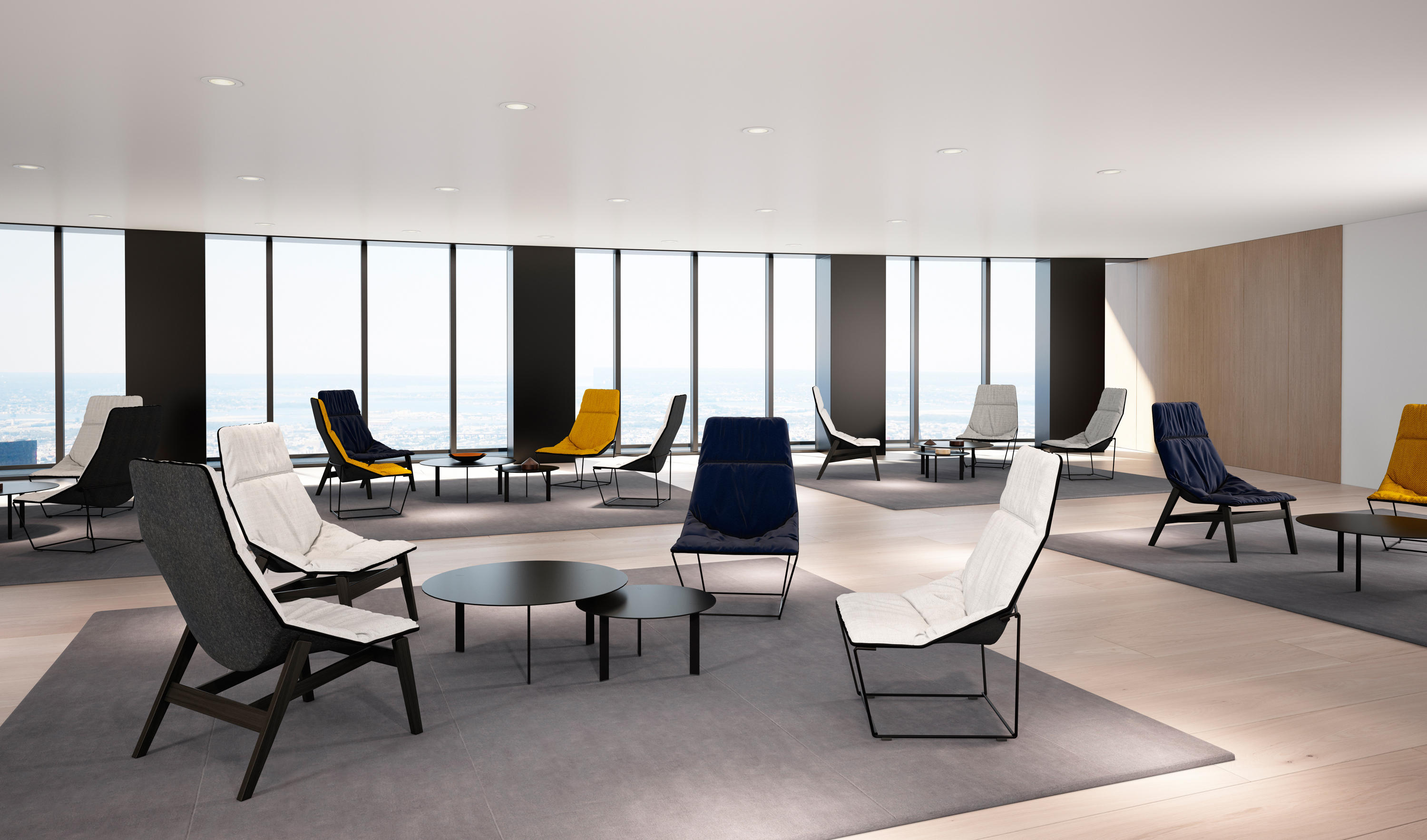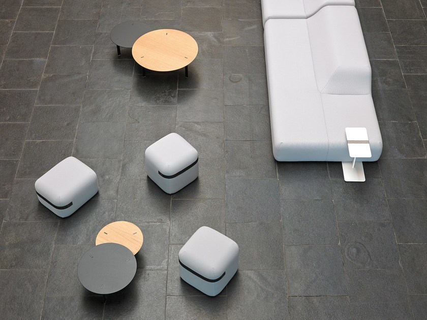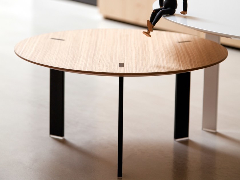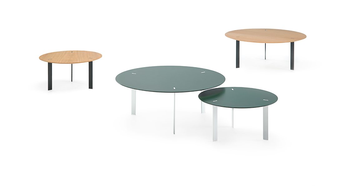 桌面采用漆面MDF或橡木贴面,由Viccarbe提供的饰面和带透明尖端的漆钢腿。