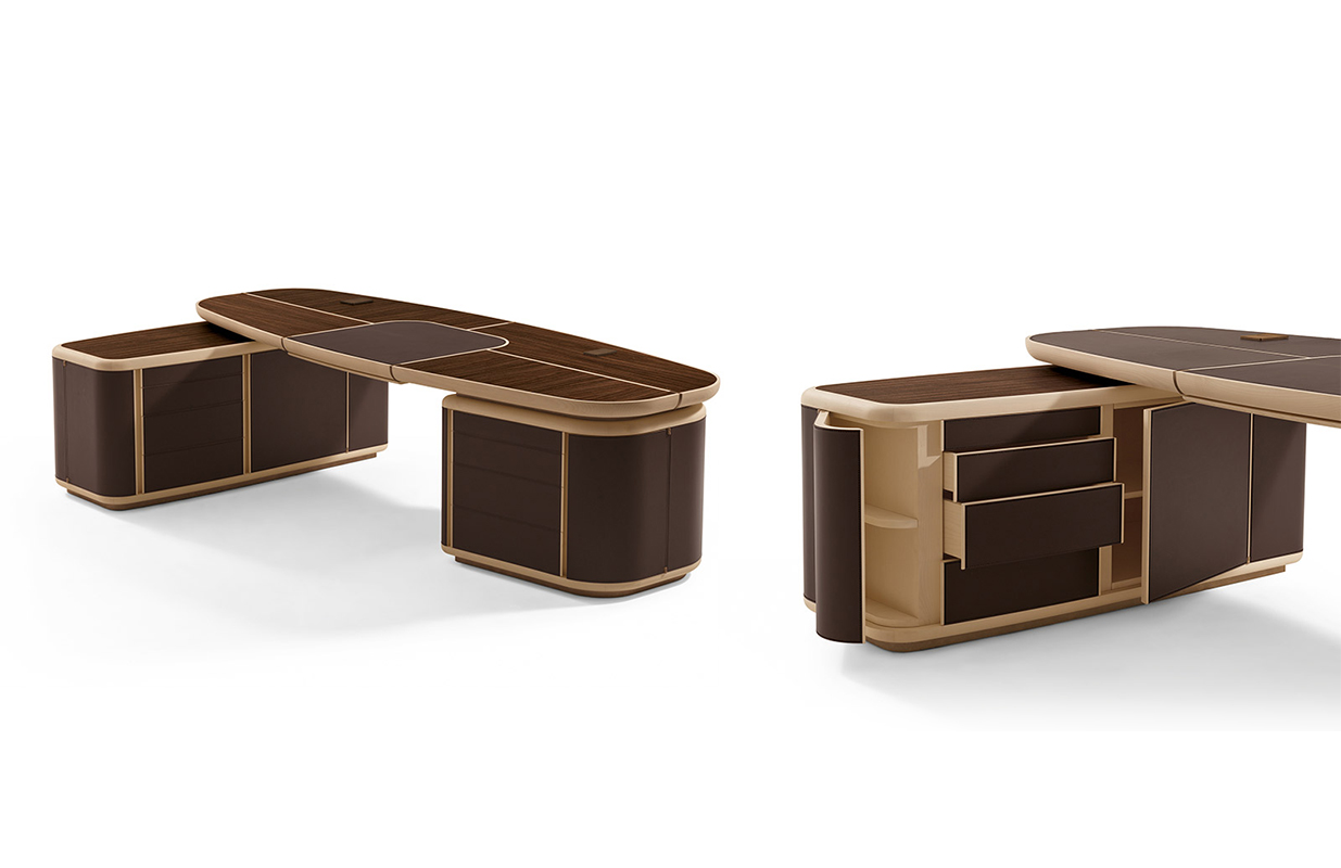 是可能的左边或者右边的操作面覆盖着 马鞍皮革,由4个抽屉和两扇门 内部开放的隔间。 可以有马鞍皮革顶部 或印度紫檀插入。