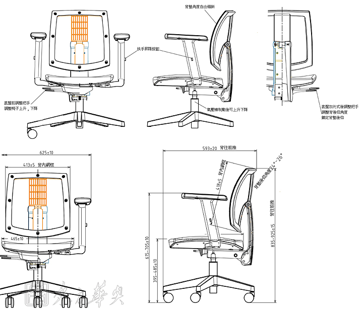 ※ 上图为职员椅的细节尺寸图,高度,宽度,厚度每个细节的尺寸标准,满足您需要的每点贴心服务!